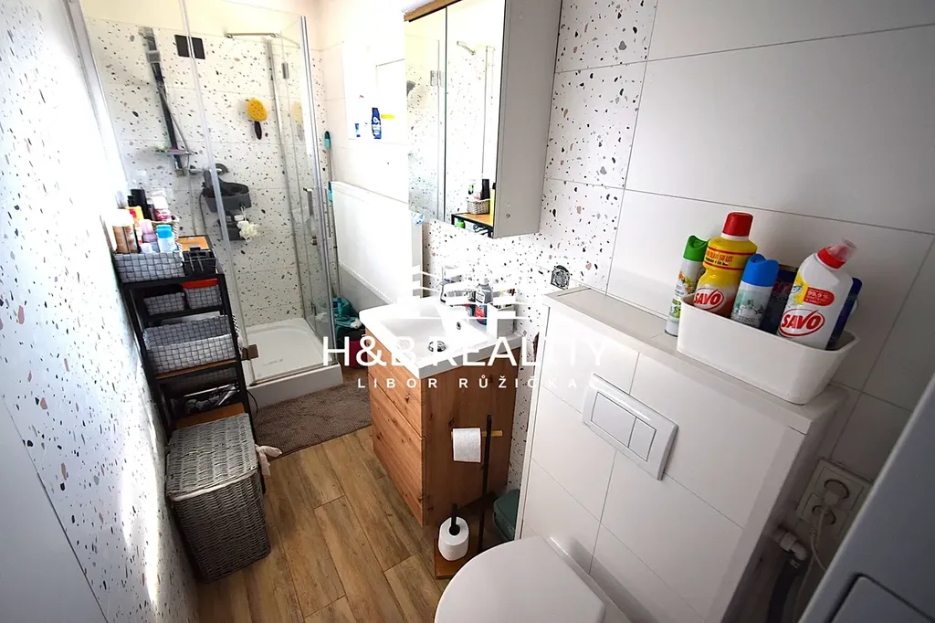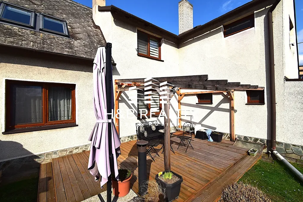 Částečně rekonstruovaný dvougenerační rodinný dům se nachází na krásném a pečlivě udržovaném pozemku se vzrostlou zelení a stromy, bazénem ( 18 m2 ), terasou, garáží ( 35 m2 ) a zahradním domkem, v klidné části obce Měšice, v blízkosti Prahy. Dispozice domu sestává v přízemí ze vstupní haly, obývacího pokoje, ložnice, kuchyně se spíží, koupelny se sprchovým koutem, samostatné toalety a komory, kterou lze využít i jako šatnu. V patře sestává z chodby s praktickou komorou, obývacího pokoje, ložnice, dětského pokoje, kompletně vybavené moderní kuchyně se spíží, koupelny se sprchovým koutem, toaletou a místem pro pračku i sušičku. V domě je také samozřejmě sklep jehož součástí je i technická místnost s plynovým kotlem, bojlery a technikou, která umožňuje využívat obecní vodovod nebo vodu z vlastní studny.
