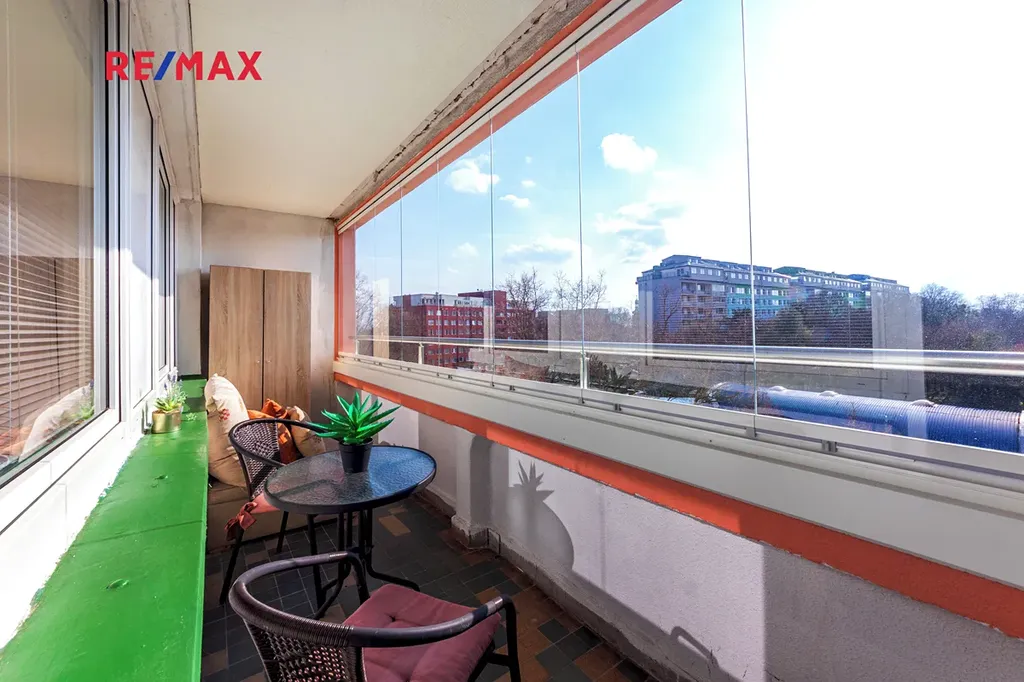 Velkou předností tohoto bytu je prostorná zasklená lodžie ( 7,9 m2 ) a poloha přímo u metra, orientace je do klidné části ( NE do ul. Vysočanská ).