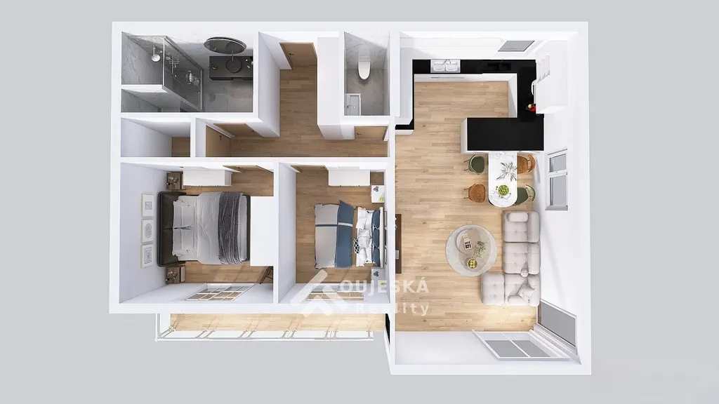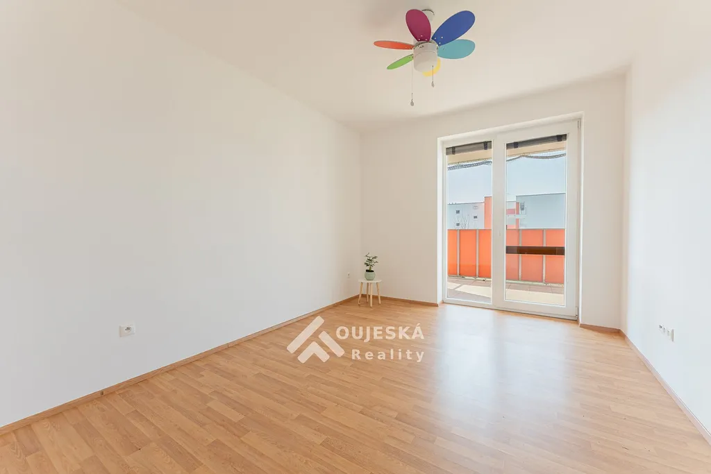 Dominantou bytu je prostorný obývací pokoj s kuchyňským koutem, orientovaný na jih, který zajišťuje dostatek přirozeného světla po celý den a příjemnou atmosféru celého prostoru.