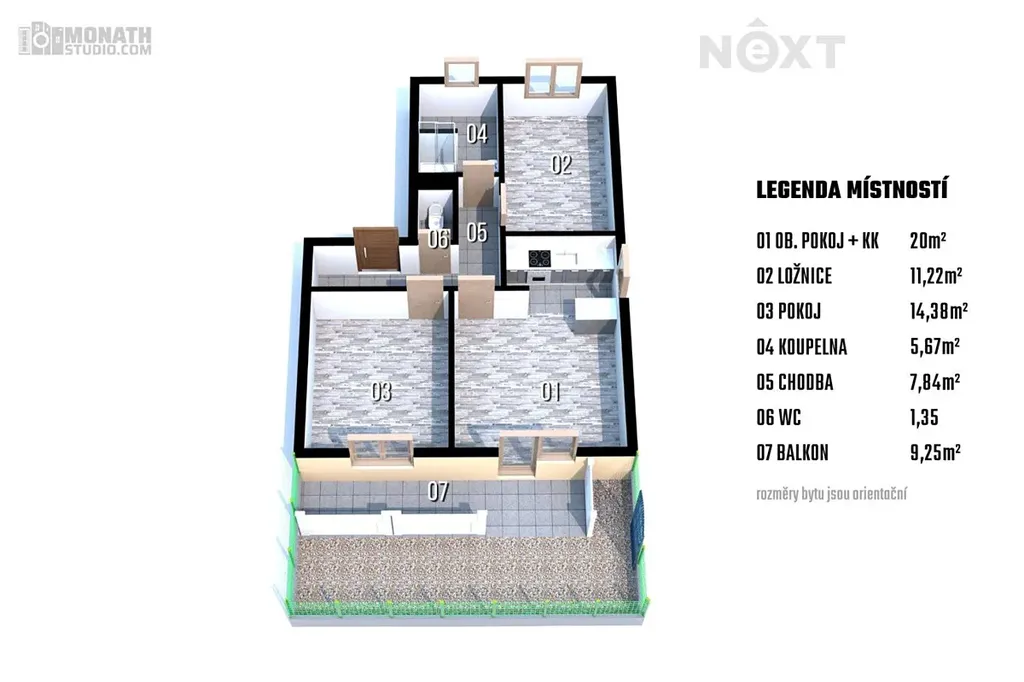 Dispozice bytu je velmi prakticky řešená. Ze vstupní předsíně o velikosti 7,84 m² je přístup do všech neprůchozích místností: