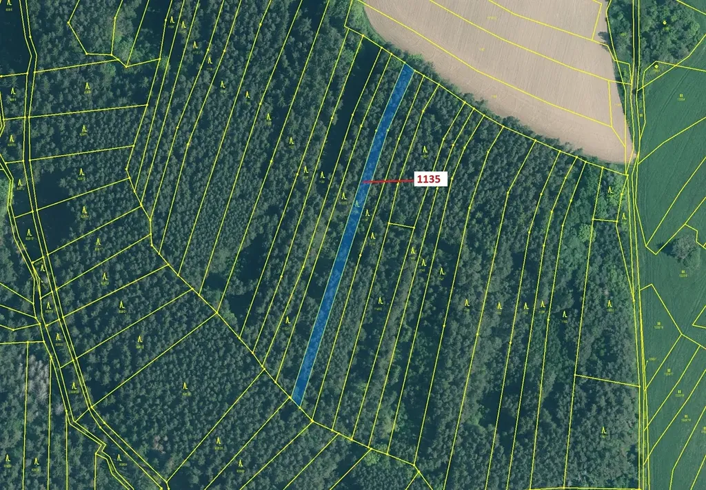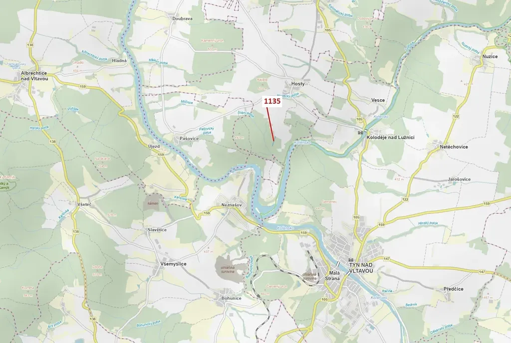 Lesní pozemek o výměře 1789 m2, parcelní číslo 1135, podíl 1/1, katastrální území Hosty, obec Hosty, obec s rozšířenou působností Týn nad Vltavou, okres České Budějovice, Jihočeský kraj. Částečně po těžbě.