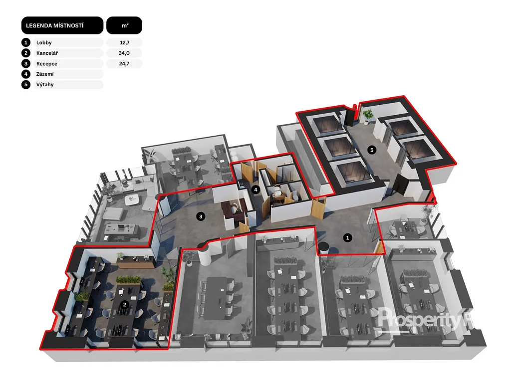 Každá kancelář je plně klimatizovaná, vybavená žaluziemi a vstup je zajištěn přes čipovou kartu.