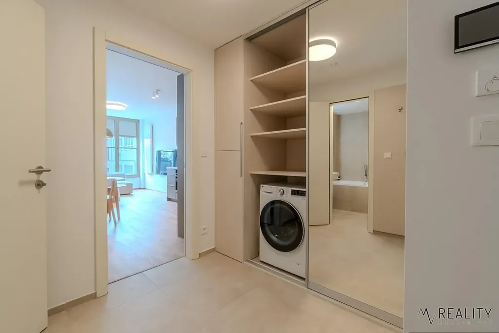 Kuchyň je propojená s obývacím pokojem a je vybavena lednicí, myčkou, mikrovlnnou troubou a dalšími spotřebiči. Součástí je také nová sedací souprava, konferenční stolek a nová televize. V ložnici se nachází vestavěná skříň, postel s novými matracemi. Na chodbě je vestavěná skříň s pračkou/sušičkou a dalším úložným prostorem.