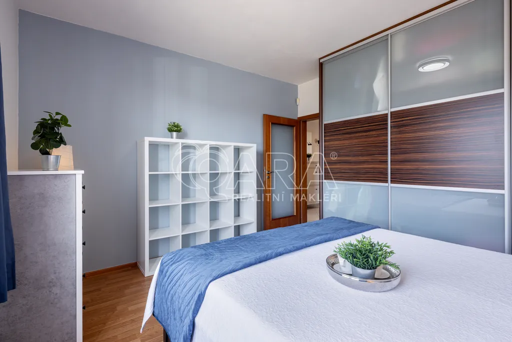 Nechybí koupelna s vanou, vnitřní komora, dostatek úložných prostor a velká okna s venkovními roletami, která bytu dávají spoustu světla i energie.