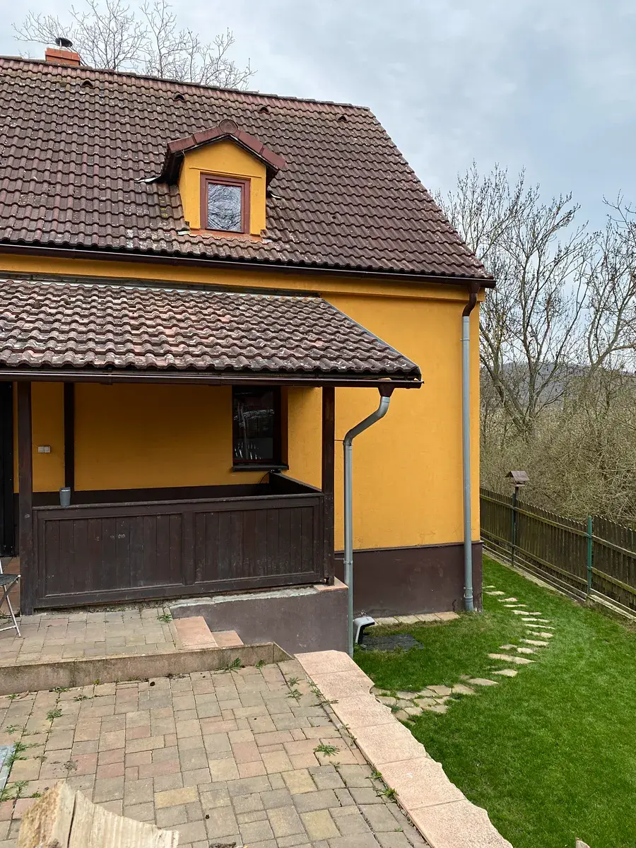 Pozemek oplocený, zatravněný, udržovaný, možnost parkování ve dvoře, automatická otevírací brána. Zahrada rovinatá a částečně svažitá, nerušený výhled do zeleně. Dům napojen na elektřinu, voda z vlastního vrtu a z původní studny ve sklepě, odpad sveden do septiku. Střešní krytina, svody, komíny i fasáda prošly výměnou či opravou.