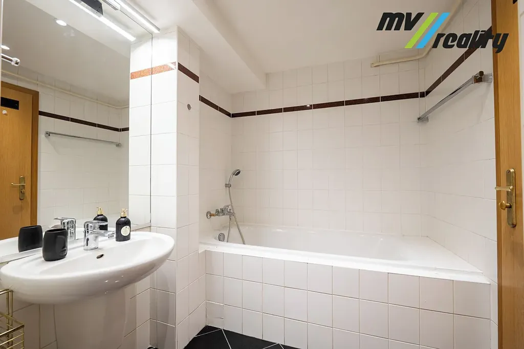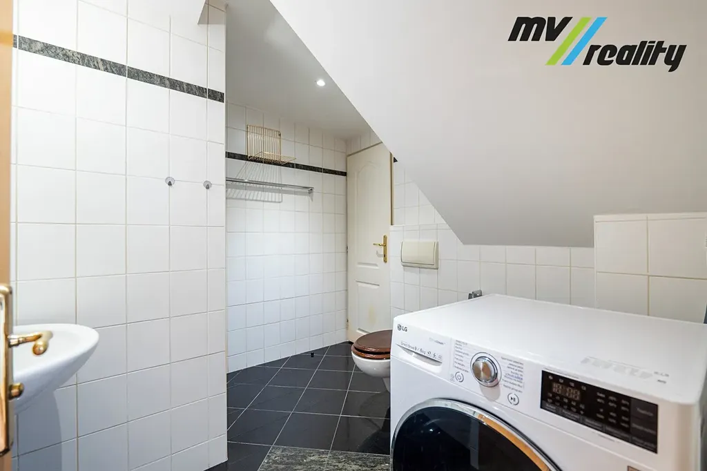 V horním podlaží bytu se nachází koupelna se sprchovým koutem a WC. Zde je umístěna i pračka. Ve spodním podlaží je druhá koupelna s vanou a WC. Byt je kompletně zařízen nábytkem a nabízí také praktické vestavné skříně.
