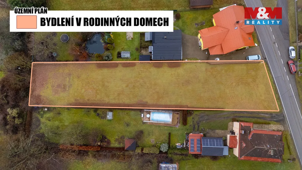 Právě tak může vypadat bydlení na rovinatém pozemku o velikosti 1 334 m² v Zásadě. Díky pravidelnému tvaru se tu dobře plánuje dům bez kompromisů a zastavitelnost 0,20 nechává kolem domu dost místa pro život, ne jen pro stavbu.