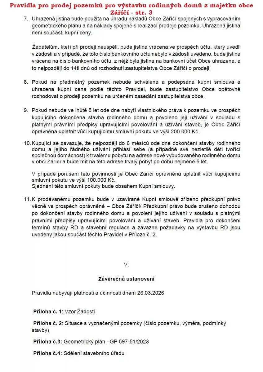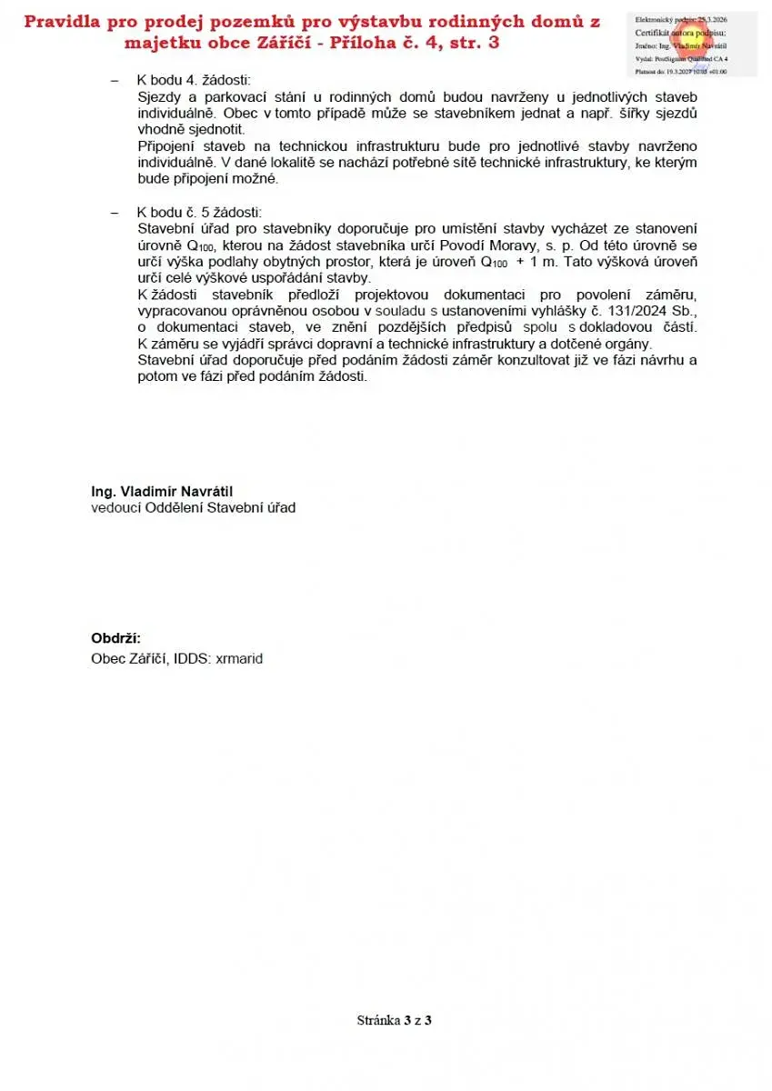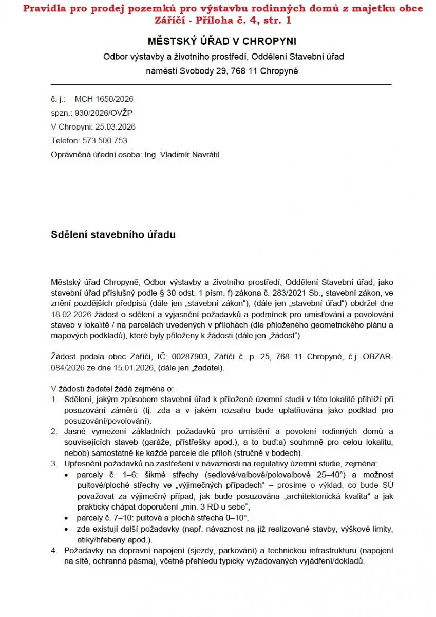 Sdělení stavebního úřadu k výstavbě naleznete v příloze č. 4 Pravidel pro prodej pozemků pro výstavbu rodinných domů z majetku obce Záříčí - lokalita U Pole.