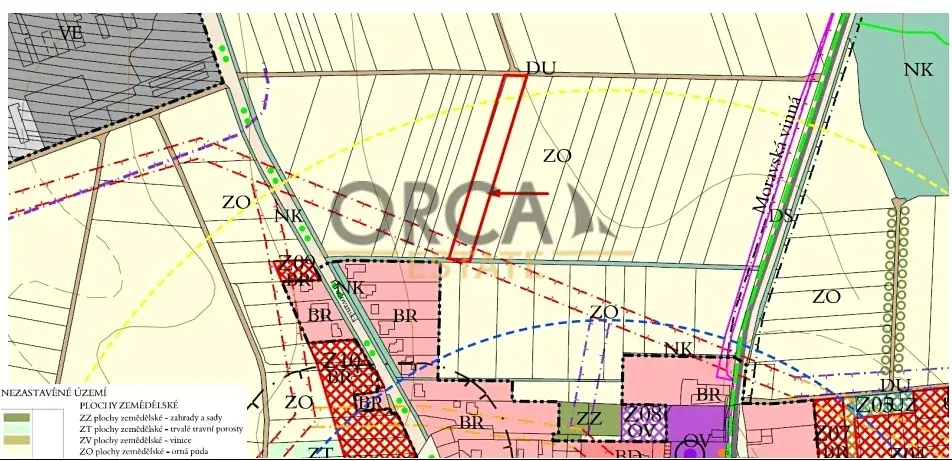 Ve výhradním zastoupení obou vlastníků nabízím pozemek zapsaný na LV č. 717 v k.ú. Jevišovka, parcela č. 1130 o výměře 4245 m2 a šířce cca 22 m. Dle katastru je pozemek evidován jako orná půda, je rovinatý, přístupný z cesty a nachází se na severu obce. V územním plánu pozemek leží v ploše zemědělské. Vhodná investiční příležitost, kdy pozemek téměř navazuje na parcelu pro bydlení (BR). Prodávají oba vlastníci uvedení na LV, nejedná se tedy pouze o prodej podílu, ale celku. V současné době je pozemek propachtován, a to na dobu neurčitou s výpovědní lhůtou 1 rok.