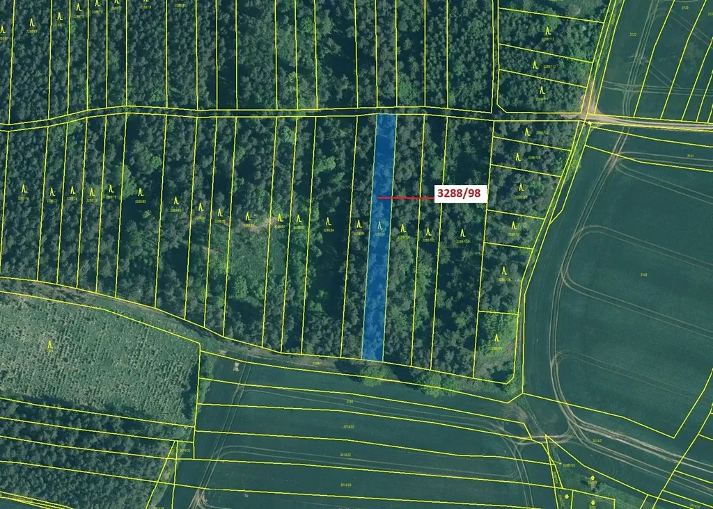 Lesní pozemek o výměře 1685 m2, parcelní číslo 3288/98, podíl 1/1, katastrální území Hosty, obec Hosty, obec s rozšířenou působností Týn nad Vltavou, okres České Budějovice, Jihočeský kraj. Po těžbě.