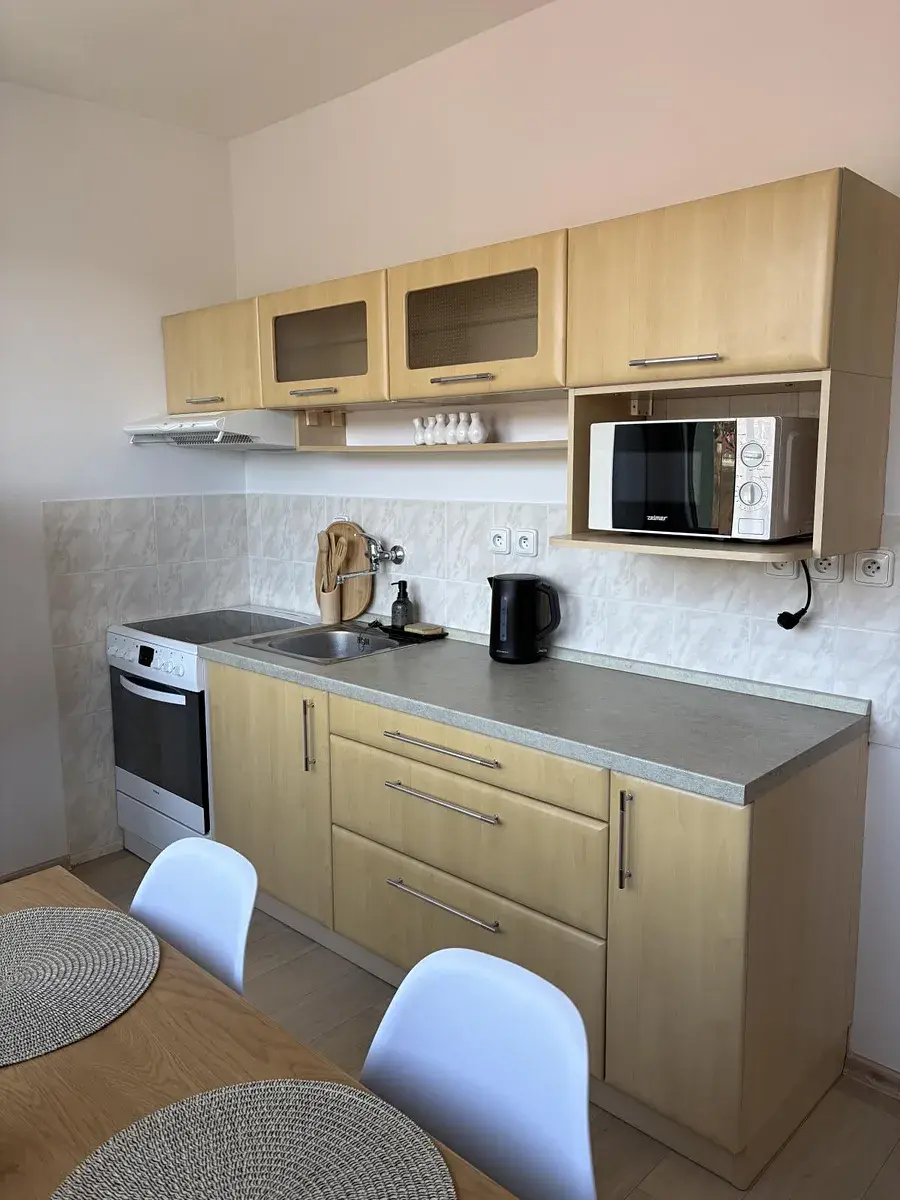 V kuchyni je elektrický sporák s troubou, lednice, mikrovlnná trouba. Jídelní stůl se dvěma židlemi. Potravní odvětrávaná skříň. K bytu přísluší sklepní kóje.
