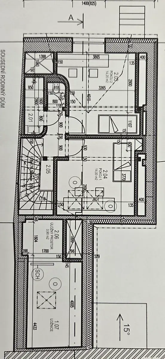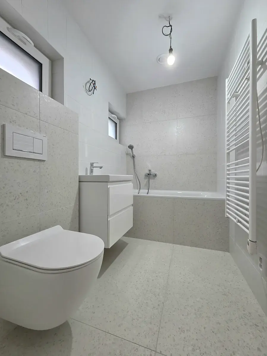 Pokud se ubereme do prvního patra, tak nalezneme dva samostatné prosvětlené pokoje, toaletu a koupelnu. Obě koupelny a samostatné toalety byly navrženy renomovaným brněnským studiem a byly vybaveny kvalitním zařízením, např. od značky Hansgrohe.