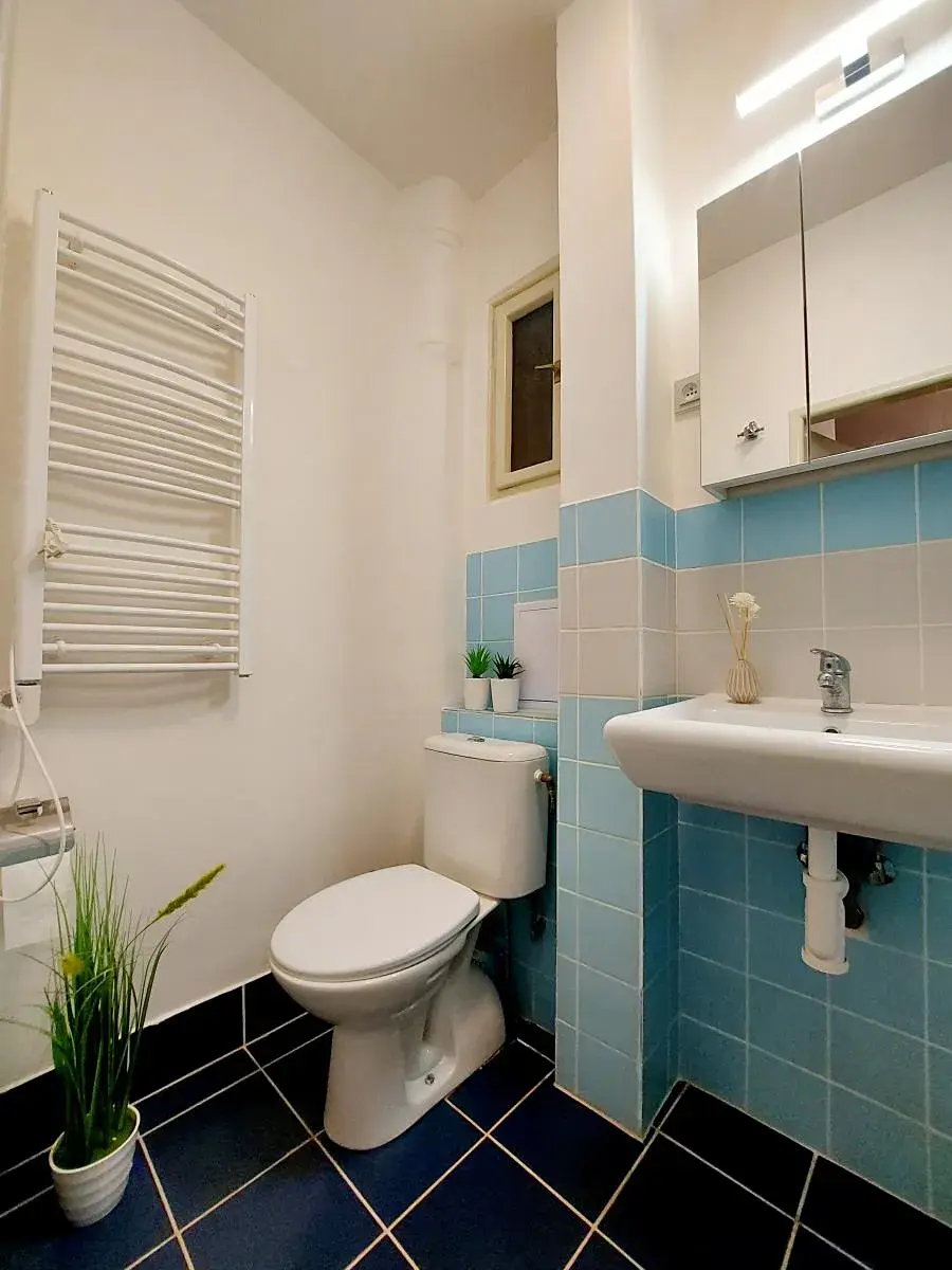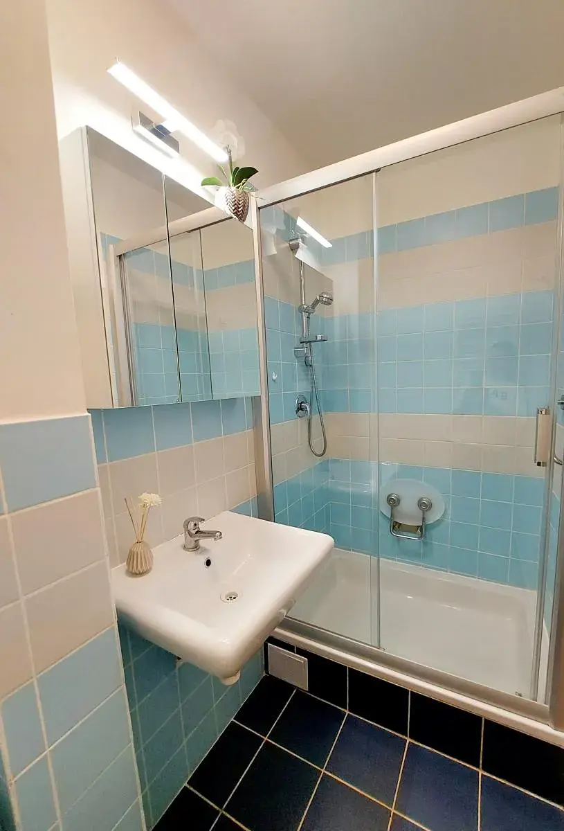 Co je určitě velmi praktické, je velká komora v předsíni, ve které je skříň a úložné police. V předsíni je také umístěna pračka s integrovanou sušičkou. Koupelna se sprchovým koutem je spojena s toaletou.