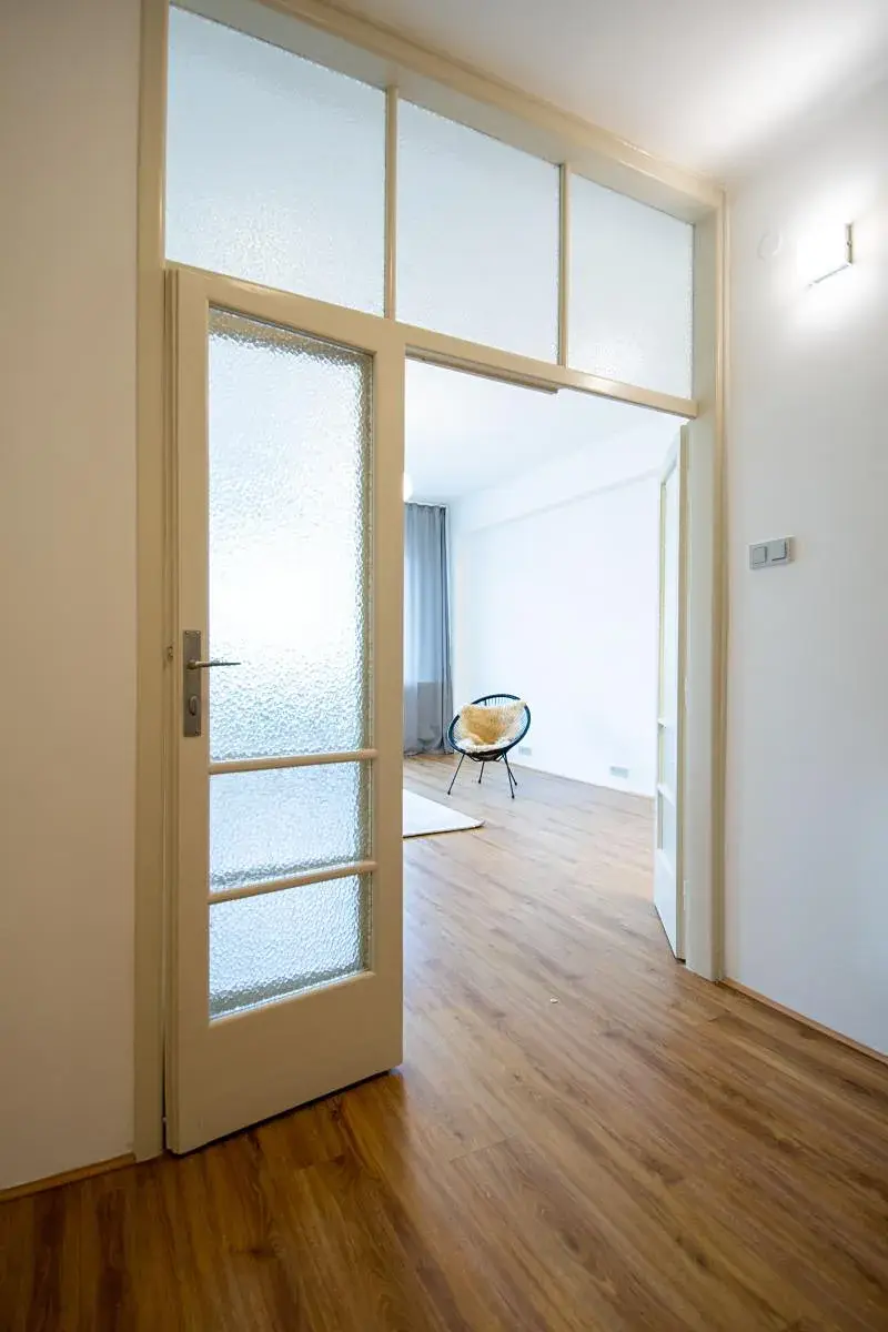 Byt v osobním vlastnictví je v 5. patře cihlového domu s výtahem. Díky velkým oknům a vyššímu patru je krásně světlý a tudíž i útulný. Před několika lety prošel kompletní rekonstrukcí, kdy z původní kuchyně vznikla menší ložnice, zato s vchodem na balkon. Vedlejší obývací pokoj je oproti tomu velmi prostorný a navazuje na něj malý, ale plně vybavený kuchyňský kout. I z obývacího pokoje vede francouzské okno, tentokrát na malou zimní zahradu, která těsně přiléhá k balkonu.