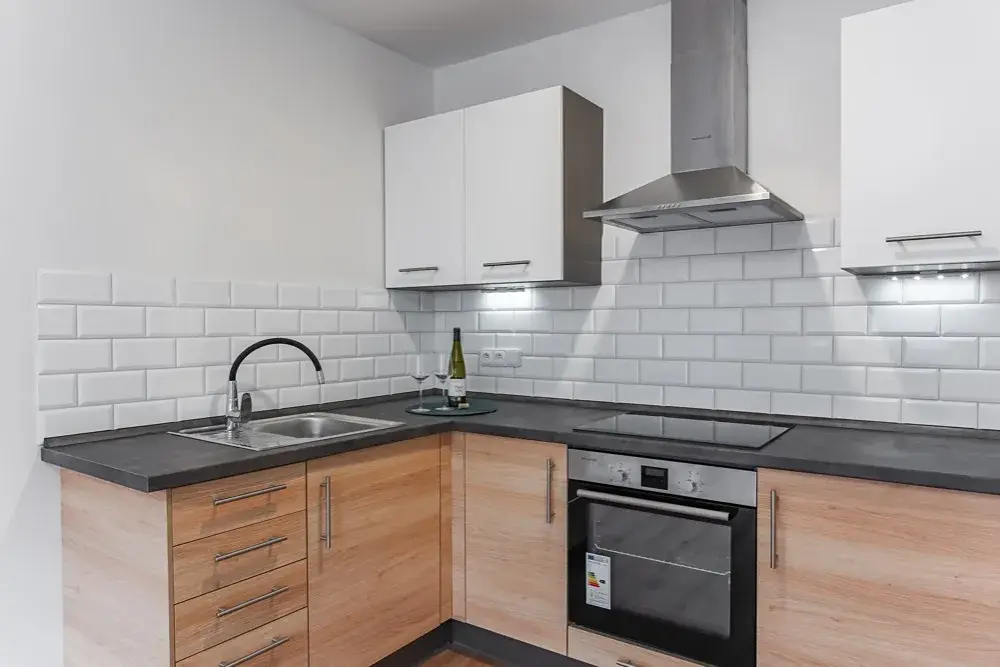 Kuchyňská linka je vybavena spotřebiči, vč. horkovzdušné trouby, varné desky, komínové digestoře a malé lednice s mrazáčkem. Instalace myčky není problém.