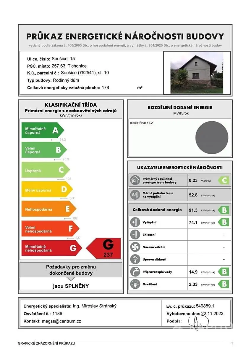 Přestože je nemovitost dle platného PENB klasifikována v energetické třídě G podle hlavního ukazatele primární energie z neobnovitelných zdrojů, průkaz současně dokládá příznivé dílčí hodnoty — obálka budovy odpovídá třídě C a celková dodaná energie třídě B.