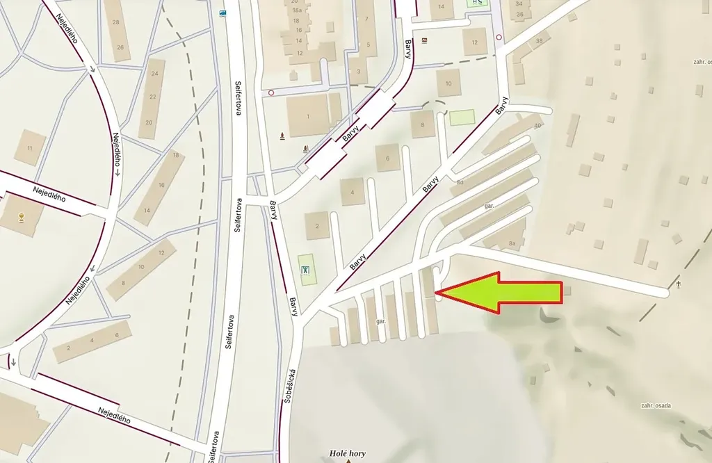 Příjezd ke garáži je po zpevněné komunikaci. Velkou výhodou je také výborná dostupnost – od bytových domů se garáž nachází přibližně 5 minut chůze.
