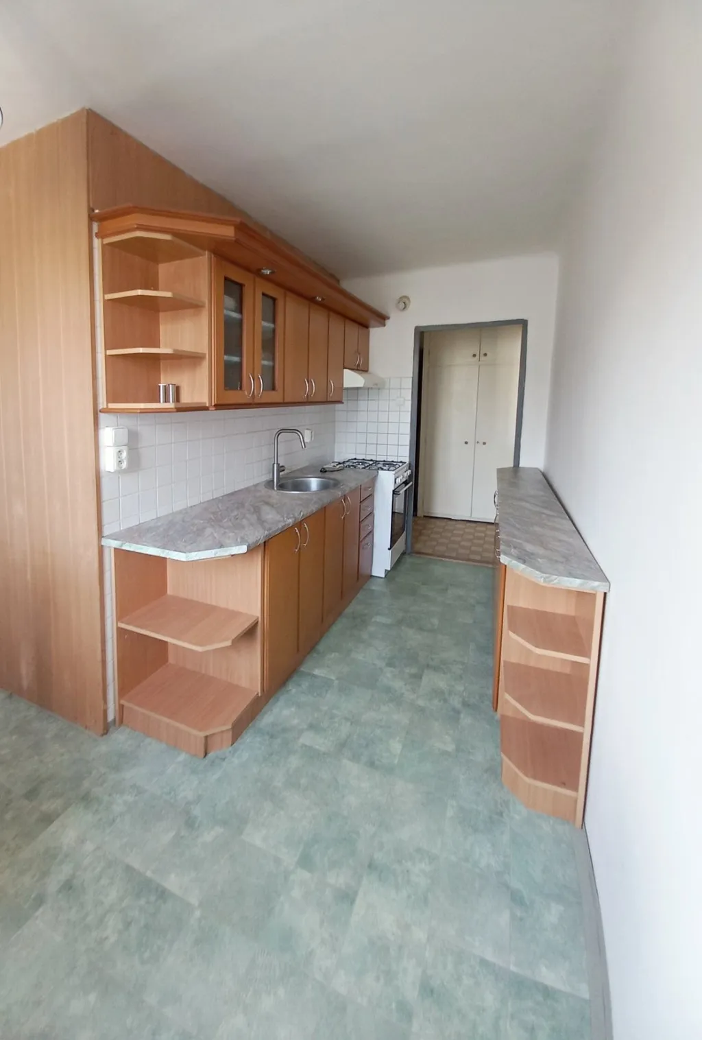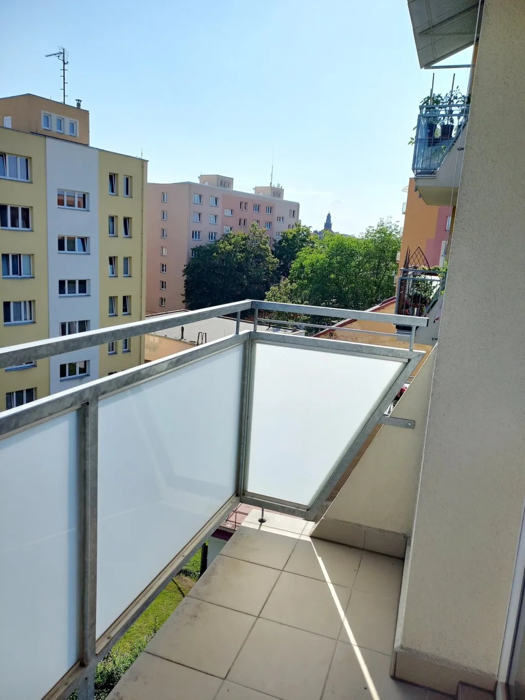 Dispozice bytu zahrnuje obývací pokoj vybavený sedací soupravou a policemi se vstupem na balkon s příjemným výhledem do zeleně. Ložnice je zařízena postelí a šatní skříní. K dispozici je také kuchyně s jídelním stolem a židlemi, lednice a pračka.