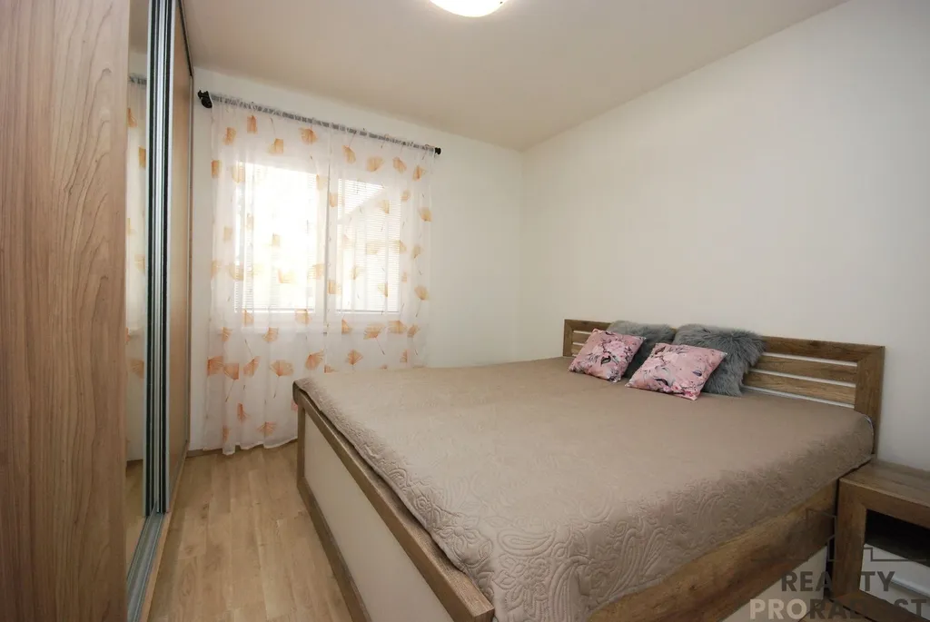 Dispozice: vstupní chodba s věšákovou stěnou a vestavnou šatní skříní, obývací pokoj se vstupem na prostornou terasu, kuchyně s kuchyňskou linkou a místem na jídelní stůl, ložnice s postelí a vestavnou šatní skříní, koupelna se sprchovým koutem, umyvadlem a pračkou a samostatné WC.