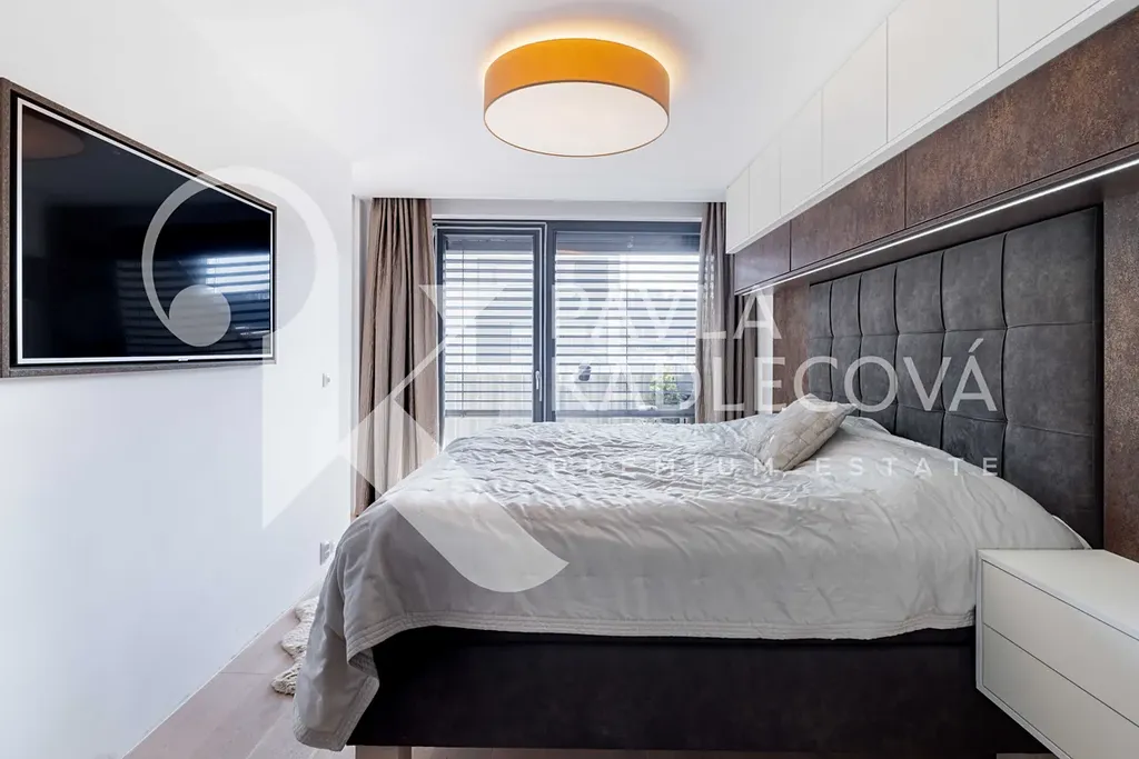 Velkoformátová okna zajišťují dostatek denního světla a podtrhují vzdušnost celého interiéru. Ložnice je propojena s velkorysou koupelnou, kde se nachází prostorný sprchový kout, designová volně stojící vana i dvojumyvadlo. Veškerá sanita a nábytek jsou značky Villeroy & Boch.