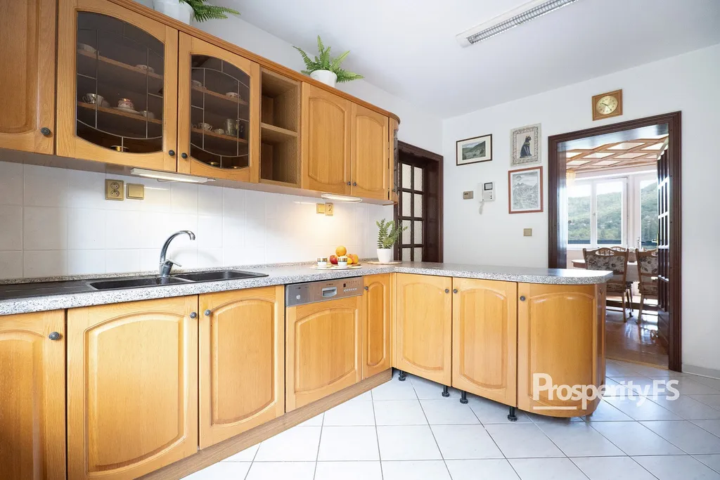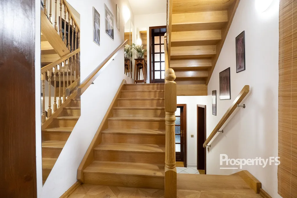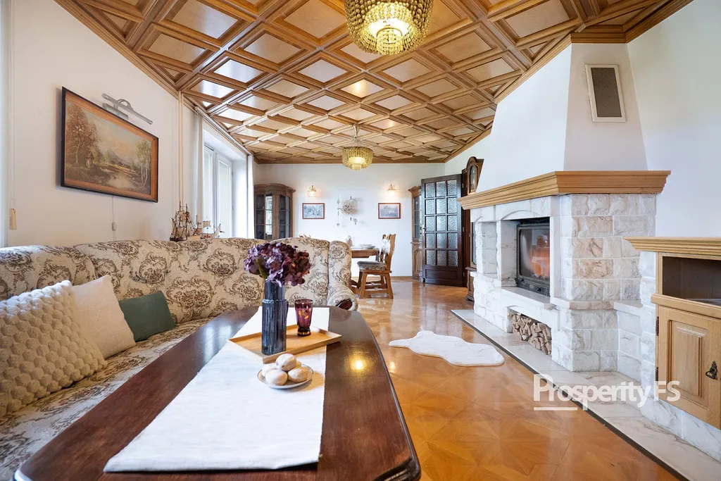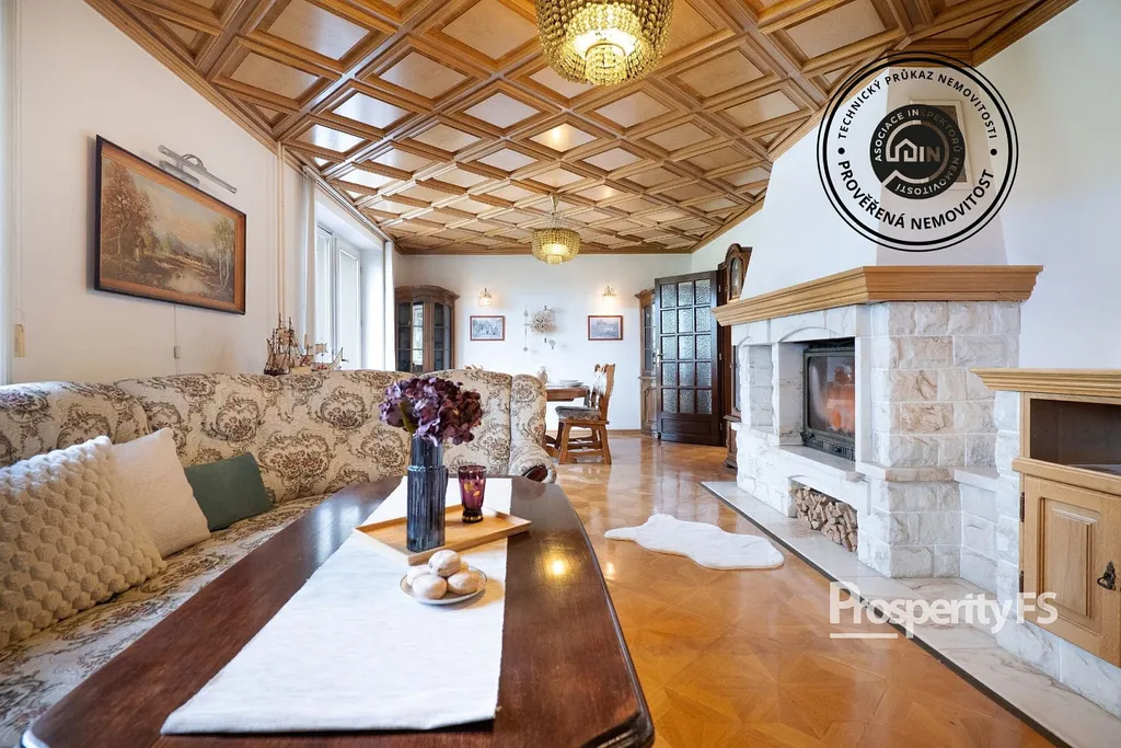 Interiér nabízí kvalitní provedení a řadu zajímavých prvků – majiteli ručně vyrobené kazetové stropy, dřevěné schodiště a mramorový krb. Pro přípravu pokrmů je kuchyň vybavena elektrickou troubou v kombinaci s varnou deskou. V domě jsou tři toalety, dvě koupelny, z toho jedna s vanou a další koupelna se sprchovým koutem, což umožňuje dostatek pohodlí i pro početnější rodinu.