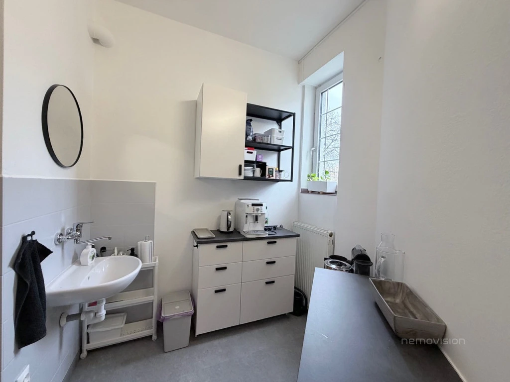 Velké okno v hlavní místnosti zajišťuje dostatek přirozeného světla a příjemnou atmosféru po celý den. Neutrální a čistý design umožňuje snadné přizpůsobení prostoru dle vašich potřeb a firemní identity.