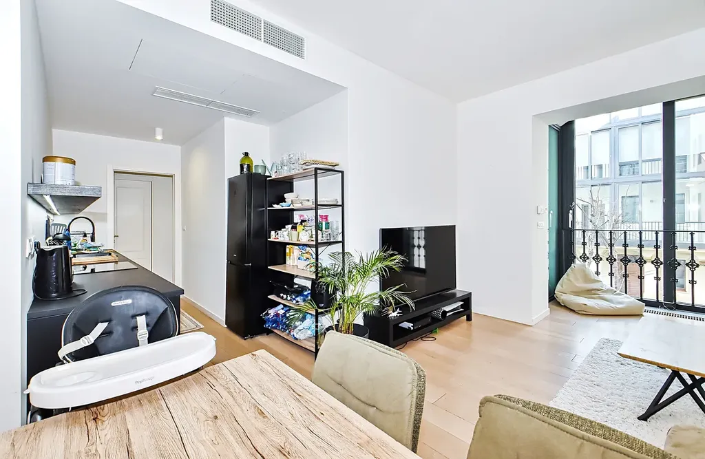 V každém pokoji je instalována klimatizace ovládaná centrální jednotkou, která zajišťuje chlazení i vytápění během celého roku. Vysoké stropy a velká panoramatická posuvná okna přivádějí do bytu dostatek denního světla a zároveň poskytují příjemný výhled do upraveného vnitrobloku plného zeleně.
