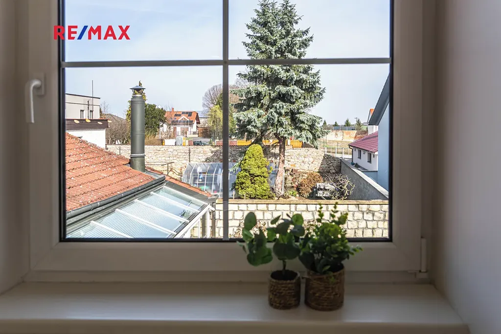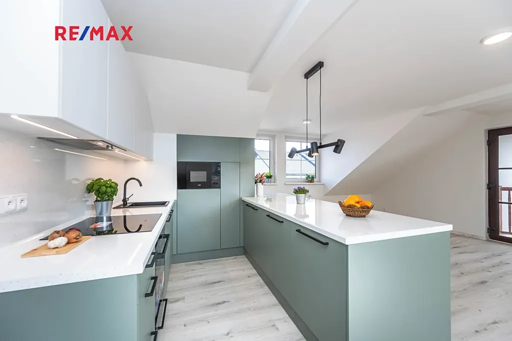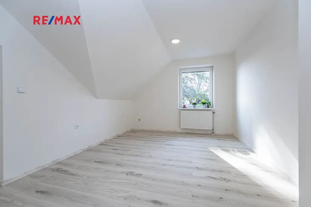 Kompletně a nově zrekonstruovaná jednotka se nachází v 2.NP rodinného domu a sestává se z velkého obývacího pokoje s kuchyňským koutem ( cca 45m2), který je vybaven chladničkou, mrazničkou, elektrickou varnou deskou, troubou, myčkou a digestoří a mikrovlnnou troubou. Všechny spotřebiče jsou vestavné a zcela nové. Ložnice měří cca 16m2 m2, dále je v bytě šatna (komora) a koupelna se sprchovým koutem, WC, umyvadlem s úložnými skříňkami a přípojkou na pračku. Prostor pod schodištěm vedoucím do bytu možno využít např. pro kolo, lyže atp.