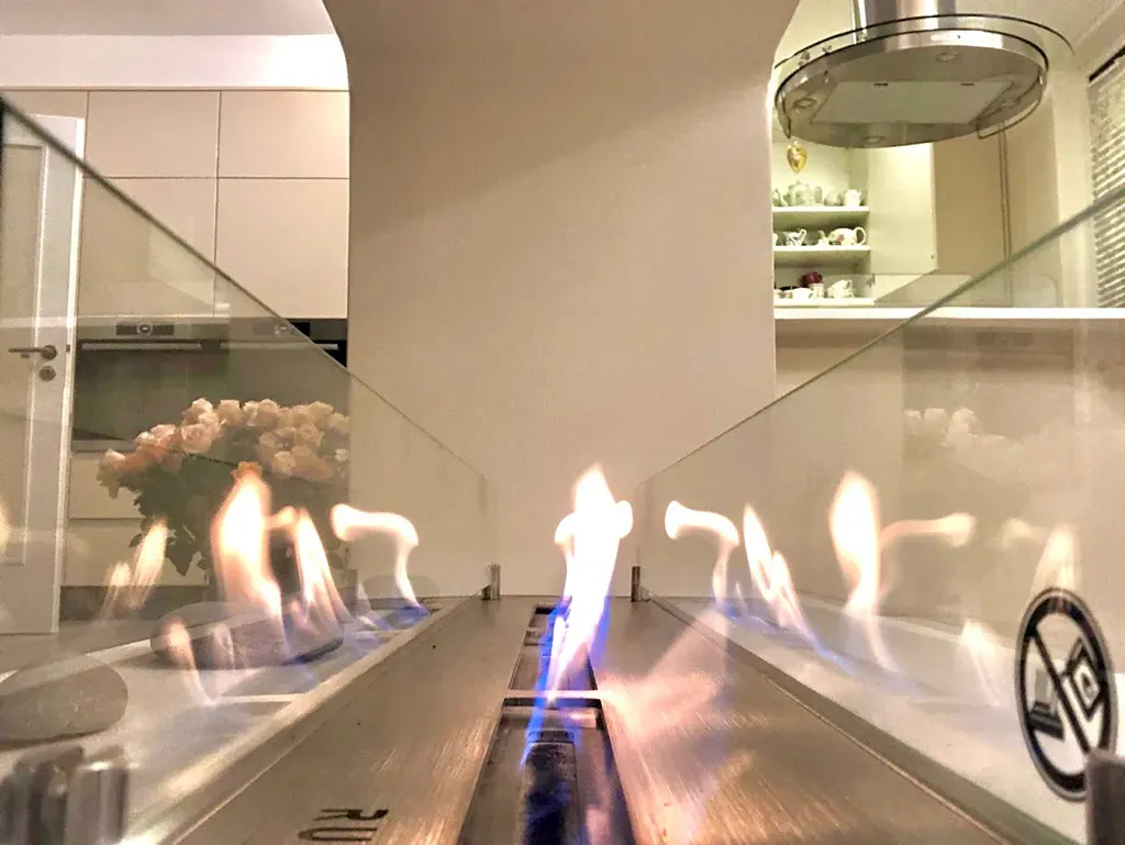 Součástí bytu je designová kuchyňská linka na míru s vestavěnými spotřebiči Bosch, ostrůvkem a rozkládacím jídelním stolem.