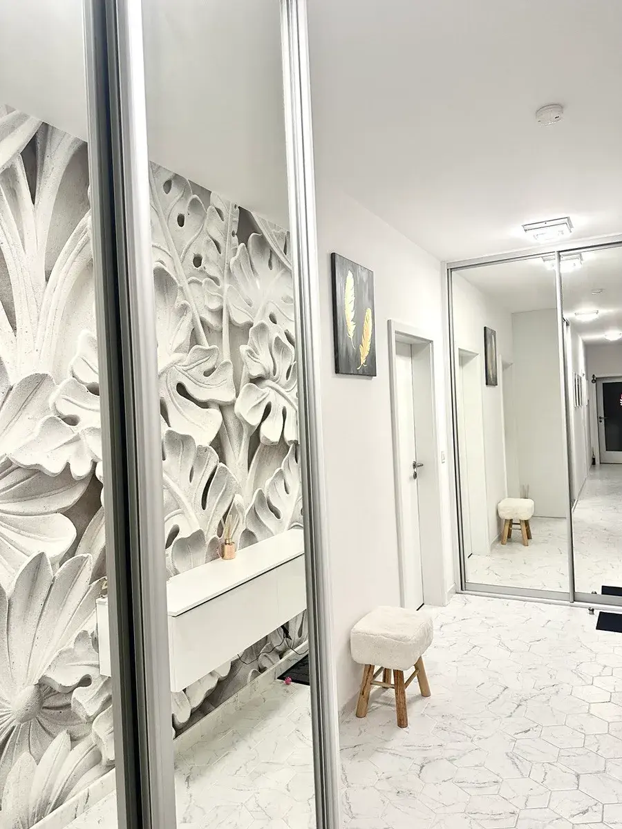 Dominantou bytu je prostorný a prosvětlený obývací pokoj s moderním krbem a pohodlnou sedací soupravou, na který navazuje balkony o velikosti 12 m² a 5 m² s krásným výhledem do okolí.