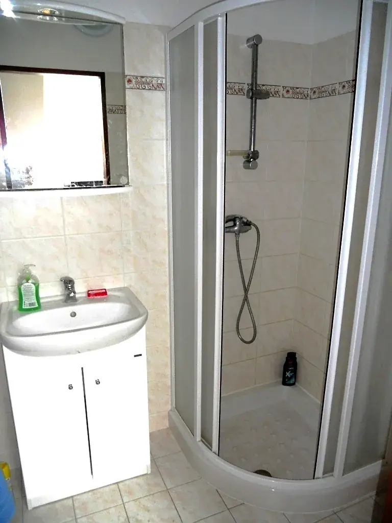 Koupelna : sprchový kout, umyvadlo, přípojka na pračku, dveře na WC.