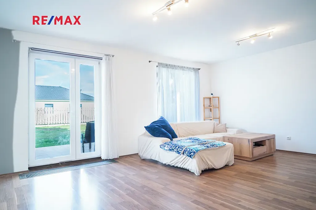 Dům působí velmi příjemně, vzdušně a zároveň útulně. Obývací pokoj nabízí dostatek prostoru pro rodinný život i odpočinek a díky velkým oknům je krásně prosvětlený po celý den. Přímý vstup na terasu a zahradu přirozeně propojuje interiér s venkovním prostorem a vytváří ideální místo pro každodenní relaxaci.