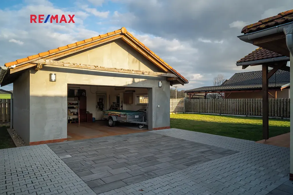 Velkým benefitem je udržovaná zahrada, která poskytuje dostatek soukromí a prostoru pro odpočinek i aktivní trávení volného času. Krytá terasa přímo navazuje na obytnou část domu a nabízí příjemné zázemí pro posezení za každého počasí. Praktickým bonusem je také garáž a dostatek místa pro parkování.