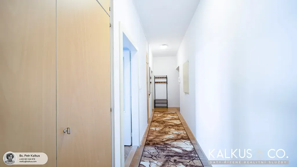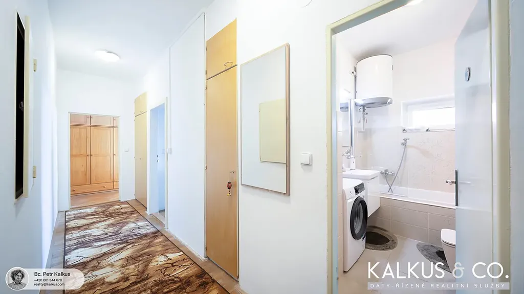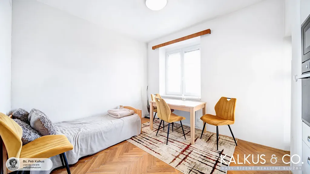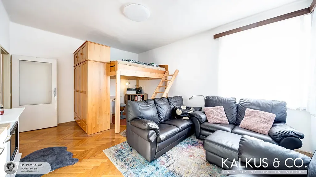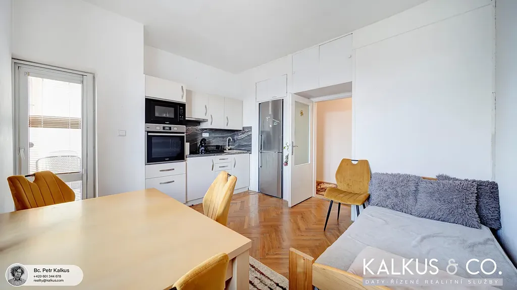 Byt prošel částečnou rekonstrukcí a je ve velmi dobrém stavu, vhodném k okamžitému užívání. Koupelna s novými obklady, dlažbou a vanou je společná s WC. V kuchyni (cca 14,8 m²) se nachází nová kuchyňská linka včetně spotřebičů. V obývacím pokoji s rohovým oknem (cca 20,8 m²) zůstává mimo jiné patrová postel z masivního dřeva, pod kterou je prostor například pro pracovnu.