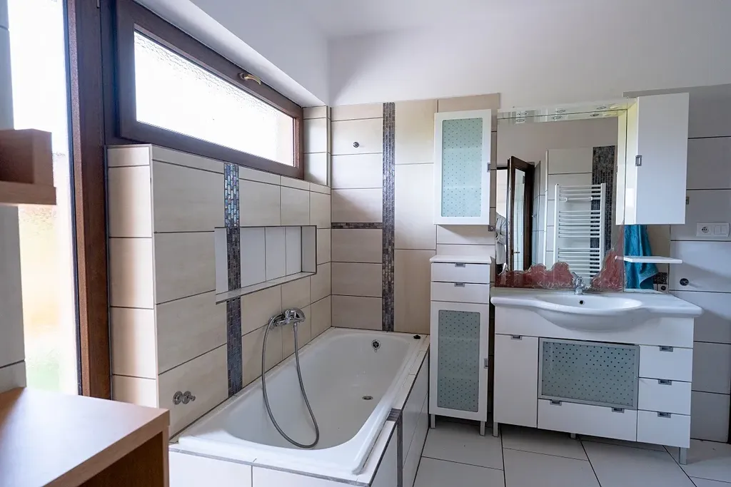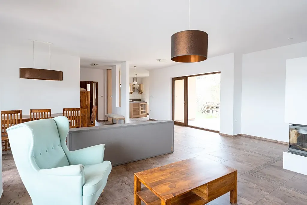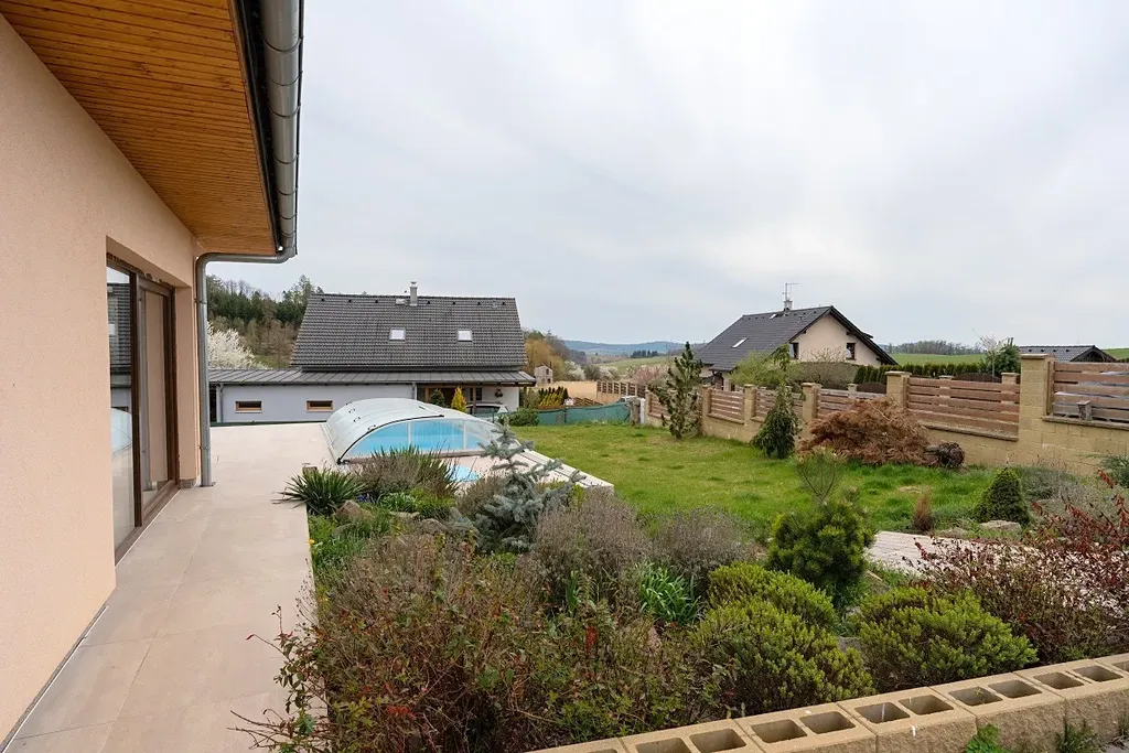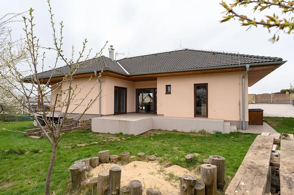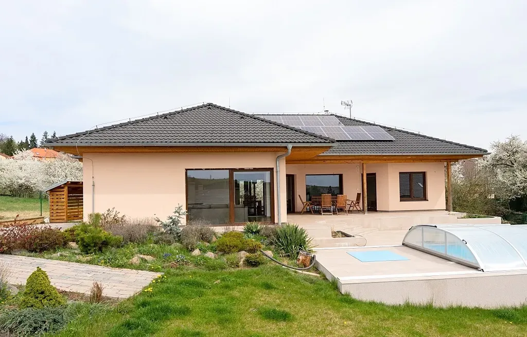 Atraktivní nabídka prodeje velmi hezkého a útulného přízemního atriového rodinného domu s venkovním bazénem a fotovoltaickými panely na střeše domu, obec Ondřejov, okres Praha-východ, ulice V Lukách. Součástí zděného a částečně podsklepeného (cca 70 m2) rodinného domu s užitnou plochou 151 m2 je prostorný obývací pokoj s kuchyní a jídelnou (60 m2) a výstupem na dvě terasy (západní k venkovnímu bazénu a východní pro poklidné ranní snídaně), tři ložnice, kde každá má výstup na terasu (16, 11 a 11 m2), koupelna s vanou, sprchou a umyvadlem (10 m2), samostatná toaleta, prádelna s dalším WC a umyvadlem, velká pracovna, která lze předělat na ložnici (25 m2) s výstupem na hlavní terasu, spíž (1,5 m2) a vstupní zádveří (4 m2). Součástí domu je také sklep o ploše 90 m2. Vytápění domu je elektrické vodovodní podlahové s možností ohřevu přes výměník v krbu, který je umístěný v obývacím pokoji. Celková rozloha slunného pozemku činí 1 103 m2, zastavěná plocha je 180 m2. Na střeše domu je deset fotovoltaických panelů na výrobu elektřiny s nástěnným boxem na dobíjení elektromobilů. Parkování je na zpevněné ploše před vstupem do domu pro minimálně 3 osobní vozy. Dům má vlastní studnu a kanalizace je svedena do vlastní čističky se zásobníkem na vodu. Napojení na sítě je možné na konci ulice. Krytý venkovní bazén s protiproudem a slanou vodou má rozměr 6 x 3 m, hloubku 1,5 m. Příjemným prvkem jsou 3 terasy u domu o celkové ploše 70 m2. PENB B. Zahrada je jen částečně založena a umožňuje tak novým majitelům dotvořit si ji dle svých představ. U vstupu na pozemek je skalka v provence stylu, dále je na zahradě jabloň, dvě třešně, maliny, angrešt, lískový ořech. Dům leží v klidné rezidenční části Ondřejova v blízkosti luk a vstupu do přilehlého lesa. Obec Ondřejov rozkládající se na jižních svazích hory Pecný se nachází 15 kilometrů od města Říčany, 35 km od Prahy a 6 km od Senohrab. Ondřejov je dobře dostupný i PID (např. přímou autobusovou linkou k metru trasy C Háje nebo do Stránčic a poté vlakem směr Praha hl. n.). V obci, jejíž historické centrum je městskou památkovou zónou, je nová moderní základní škola, dvě mateřské školy (státní i soukromá), cukrárna, kavárna, lékárna, dva obchody s potravinami, hospoda a oblíbená restaurace s pizzerií. Dále je zde skvěle fungující sportovně kulturní centrum s rozmanitou nabídkou aktivit, kroužků a lekcí pro děti i dospělé. Nad Ondřejovem je také známá hvězdárna – pracoviště Astronomického ústavu AV ČR. Vedení obce pravidelně organizuje různé společenské akce, na kterých se zdejší obyvatelé rádi schází a baví. Nákupem domu, který je k nastěhování ihned, nezískáváte jen nové bydlení, ale útulný domov s přátelskými sousedy.