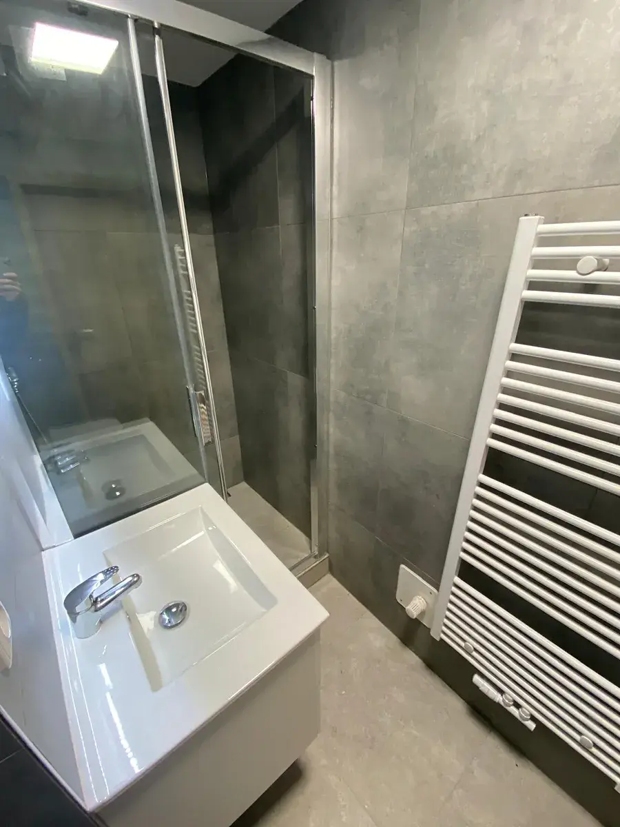 Koupelna je laděna do elegantního šedého designu a disponuje sprchovým koutem. WC je samostatné.