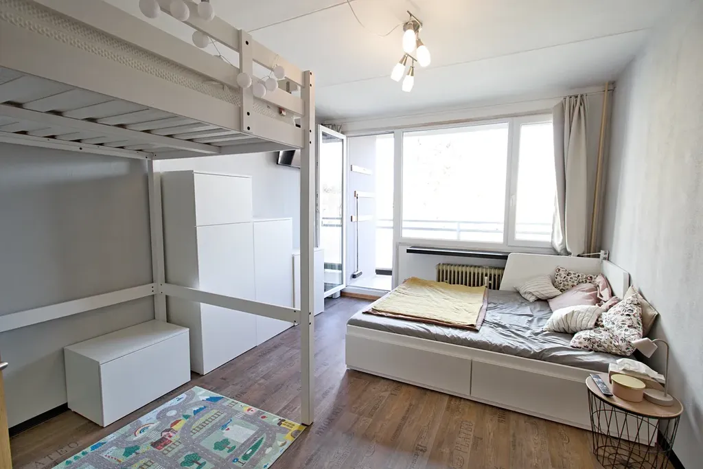 Z obývacího pokoje je vstup na prostornou lodžii s orientací na východ. K bytu náleží sklepní kóje v přízemí domu.