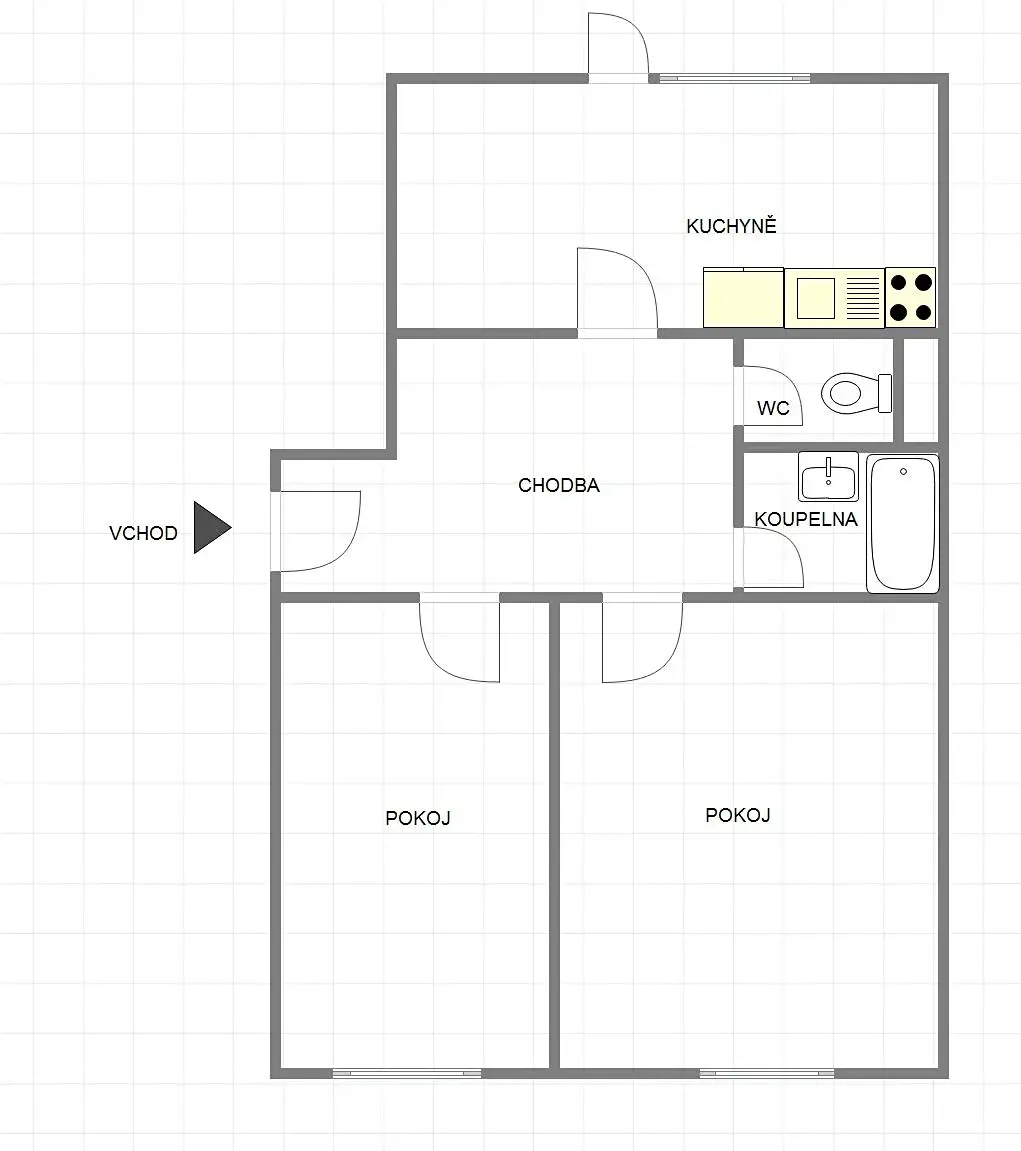 - kuchyňská linka, plynový sporák, mikrovlnná trouba, odsavač par, lednice, koupelna s vanou a WC