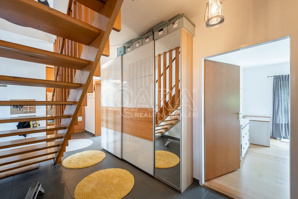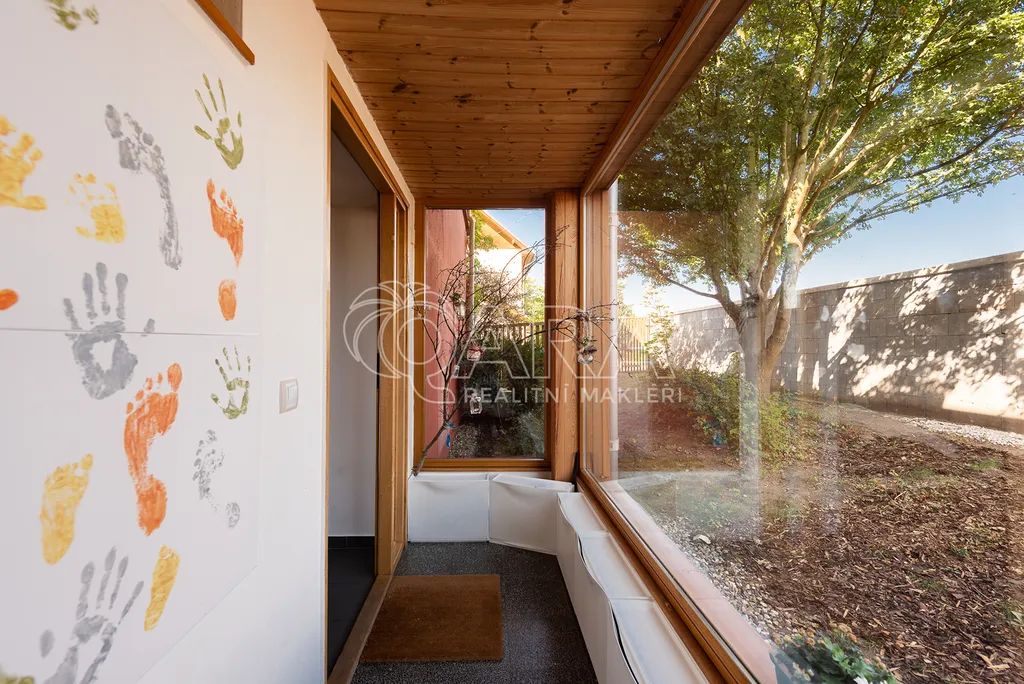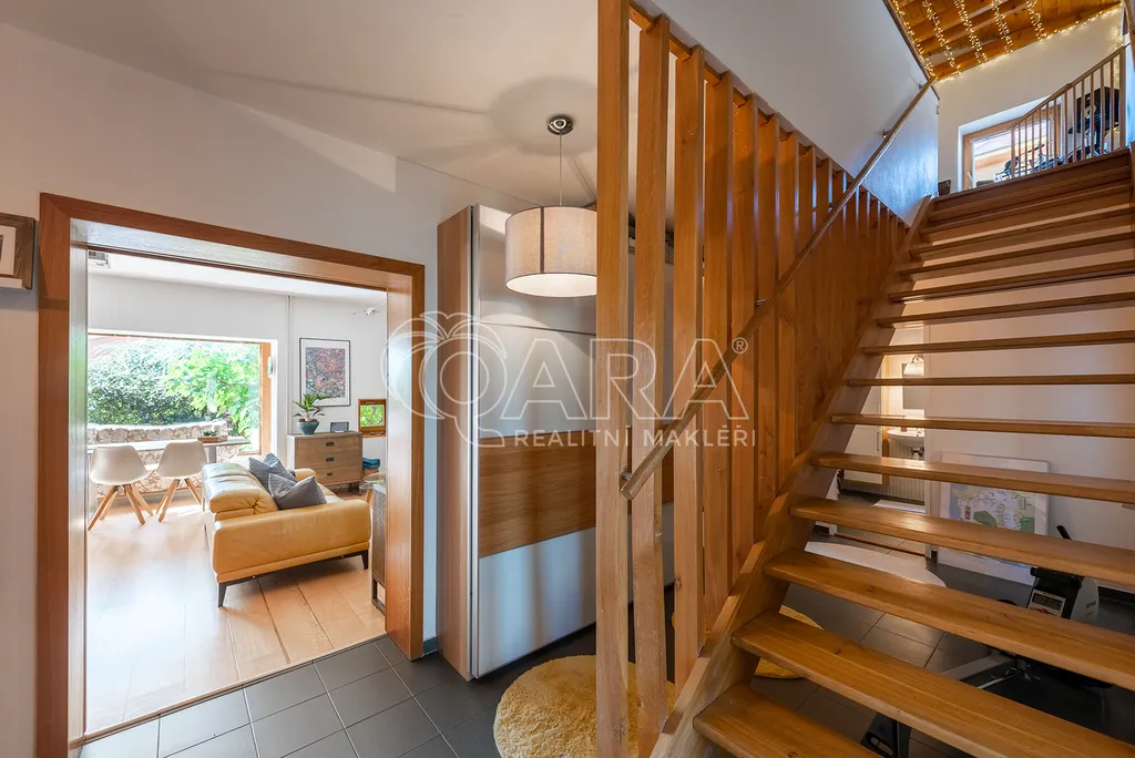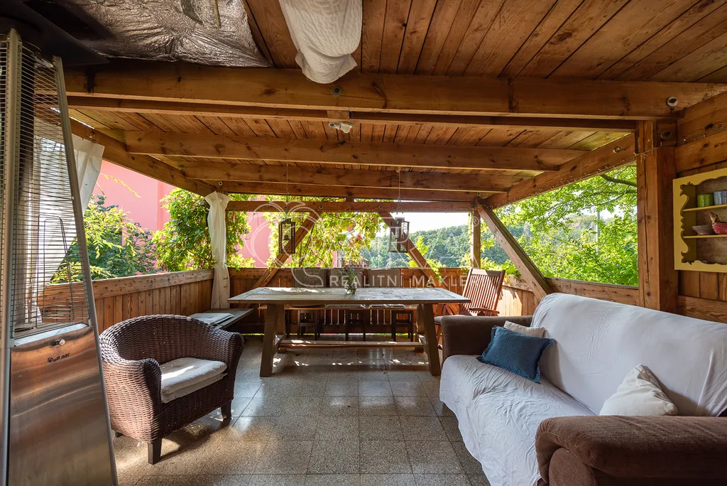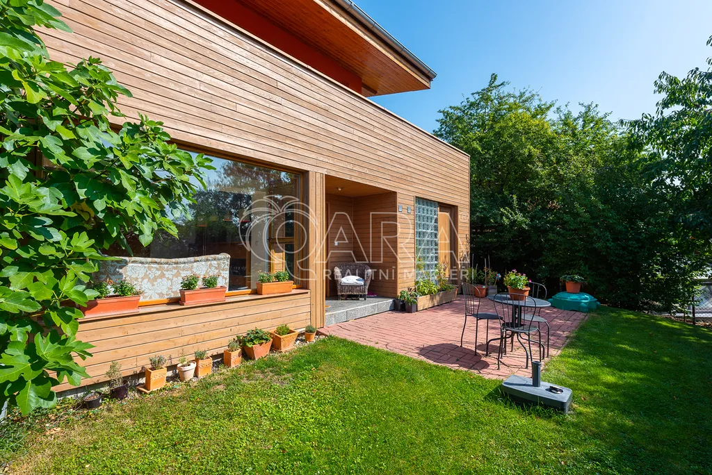 Dvoupodlažní dům 5+kk s garáží je charakteristický použitím přírodních materiálů a propojením se zahradou, která nabízí žádané soukromí. Důležitou součástí domu je rozlehlá terasa navazující na téměř všechny místnosti ve druhém podlaží. Díky krásnému výhledu na údolí je ještě umocněno všudypřítomné spojení s přírodou.