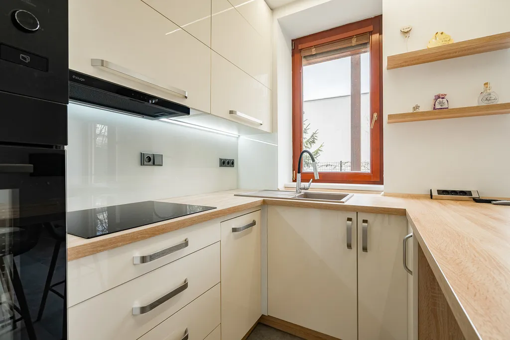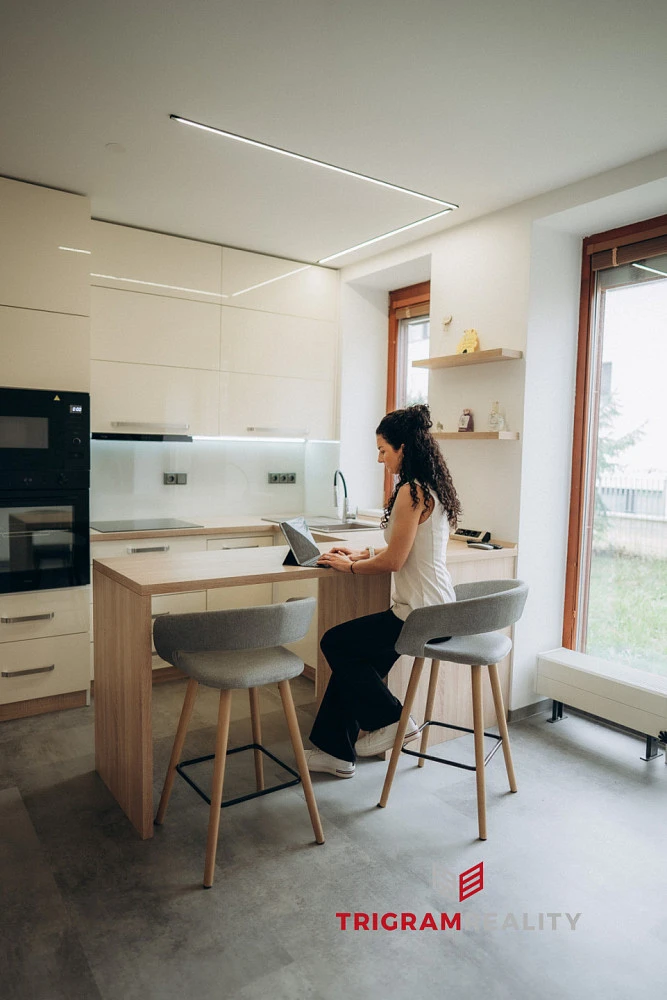 Kuchyňská linka: Je vybavena vestavěnými spotřebiči – myčkou, mikrovlnnou troubou a troubou. K dispozici je také lednice s mrazákem.