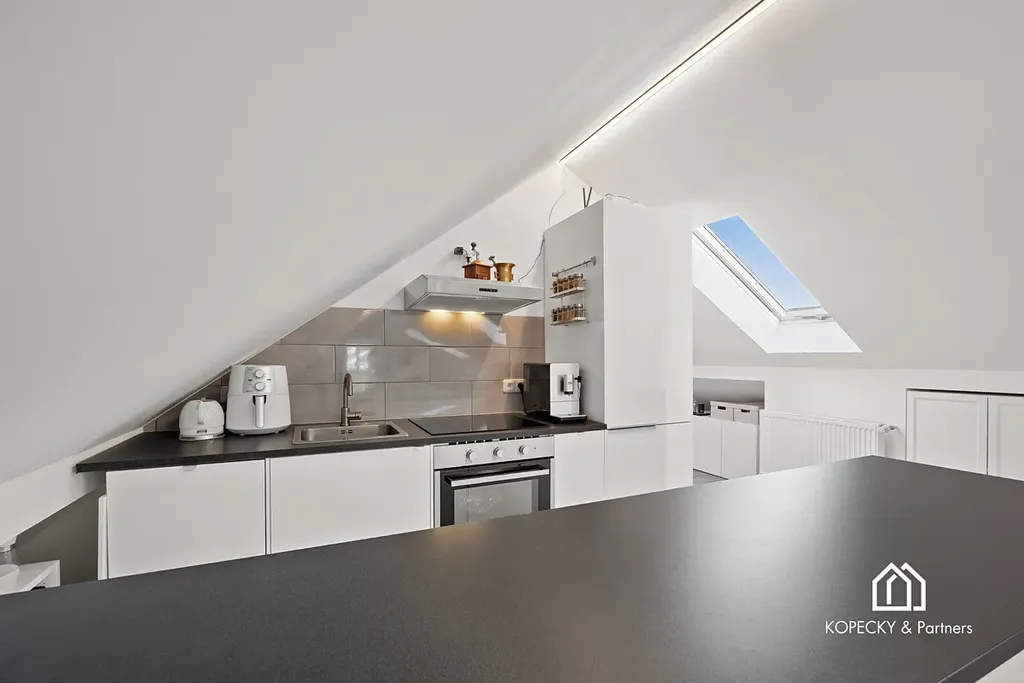 Hlavní obytný prostor působí světlým a příjemným dojmem, o což se starají nová střešní okna s trojskly, zajišťující kvalitní tepelnou i akustickou izolaci. Dispozice je řešena tak, aby nabídla dostatek komfortu i funkčnosti – od obývací části přes kuchyňskou zónu až po možnost vytvoření pracovního místa. Samostatná ložnice je situovaná tak, aby poskytovala soukromí a klid. Koupelna je moderní, čistá a prakticky řešená.