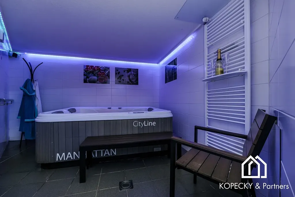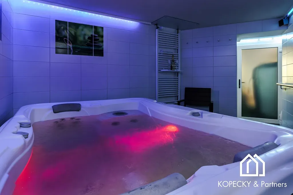 Nemovitost nabízí soukromé wellness s vířivkou a saunou pro dokonalou relaxaci. Venku se nachází vyhřívaný bazén s protiproudem, udržující teplotu na příjemných 30 °C, což umožňuje koupání po celý rok. Pro milovníky zimních sportů je na pozemku k dispozici lyžařský vlek ideální pro začátečníky.