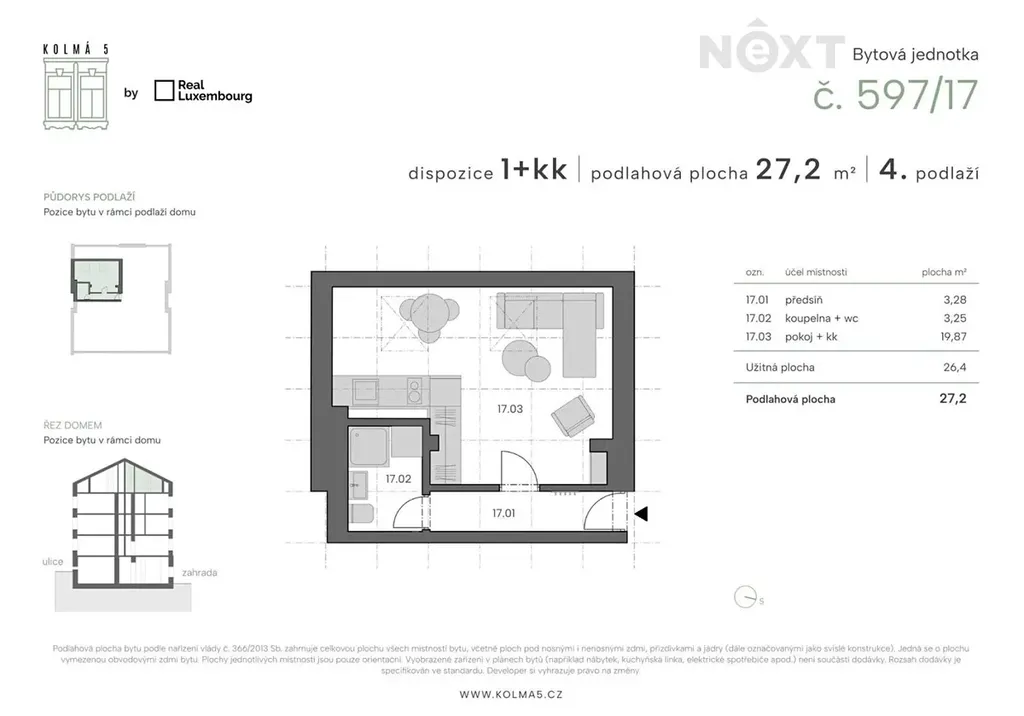 Tato konkrétní jednotka č.17 o dispozici 1kk a podlahové ploše 27,2 m2 se nachází ve 4 nadzemním podlaží s výhledem do zahrady. Je členěna na vstupní chodbu ze které je přístup do koupelny s wc, a dále obývacího pokoje s kuchyňským koutem. Přesné rozložení místností, či možný budoucí stav si můžete prohlédnout na přiloženém půdorysu a vizualizacích.