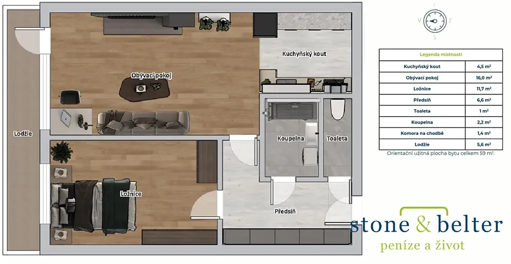 Dispozici tvoří chodba 6,6 m², obývací pokoj s kuchyňským koutem 16 m², ložnice 11,7 m², koupelna 2,2 m², samostatné WC 1 m², lodžie 4,6 m² a komora na chodbě mimo byt 1,4 m². Orientace bytu je na východ.