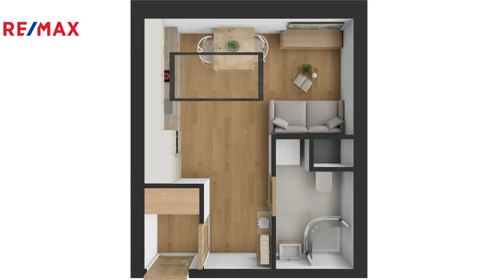 Dispozice bytu je prakticky řešená a nabízí vstupní chodbu, prostorný a světlý pokoj, kuchyňský kout, koupelnu s WC a sprchovým koutem. Součástí koupelny je také topný žebřík, pračka, zrcadlová skříňka a umyvadlová skříňka. Kuchyňská linka je nová a vybavena elektrickou troubou, sklokeramickou varnou deskou, myčkou nádobí a volně stojící lednicí. Nechybí celkové osvětlení celého bytu.