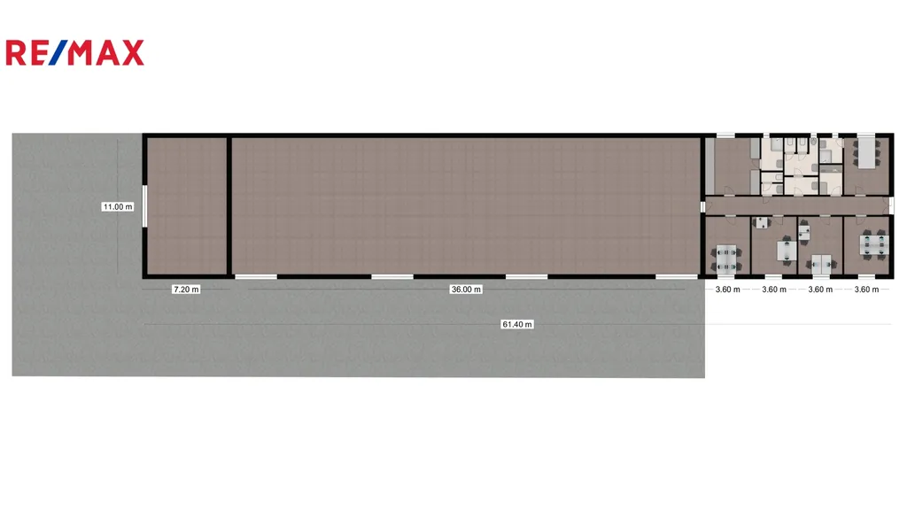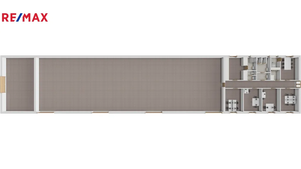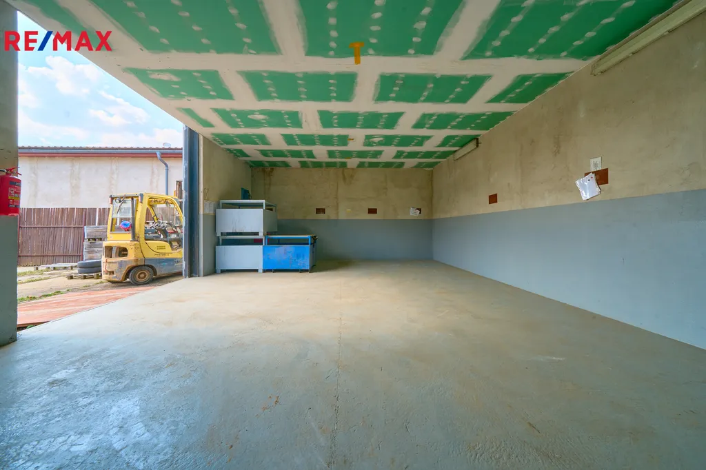 Na administrativní část navazuje zděná výrobní/skladovací hala (cca 480m2) s plechovou střechou, vybavená pěti vjezdy, což zajišťuje vysokou variabilitu využití i efektivní logistiku provozu.