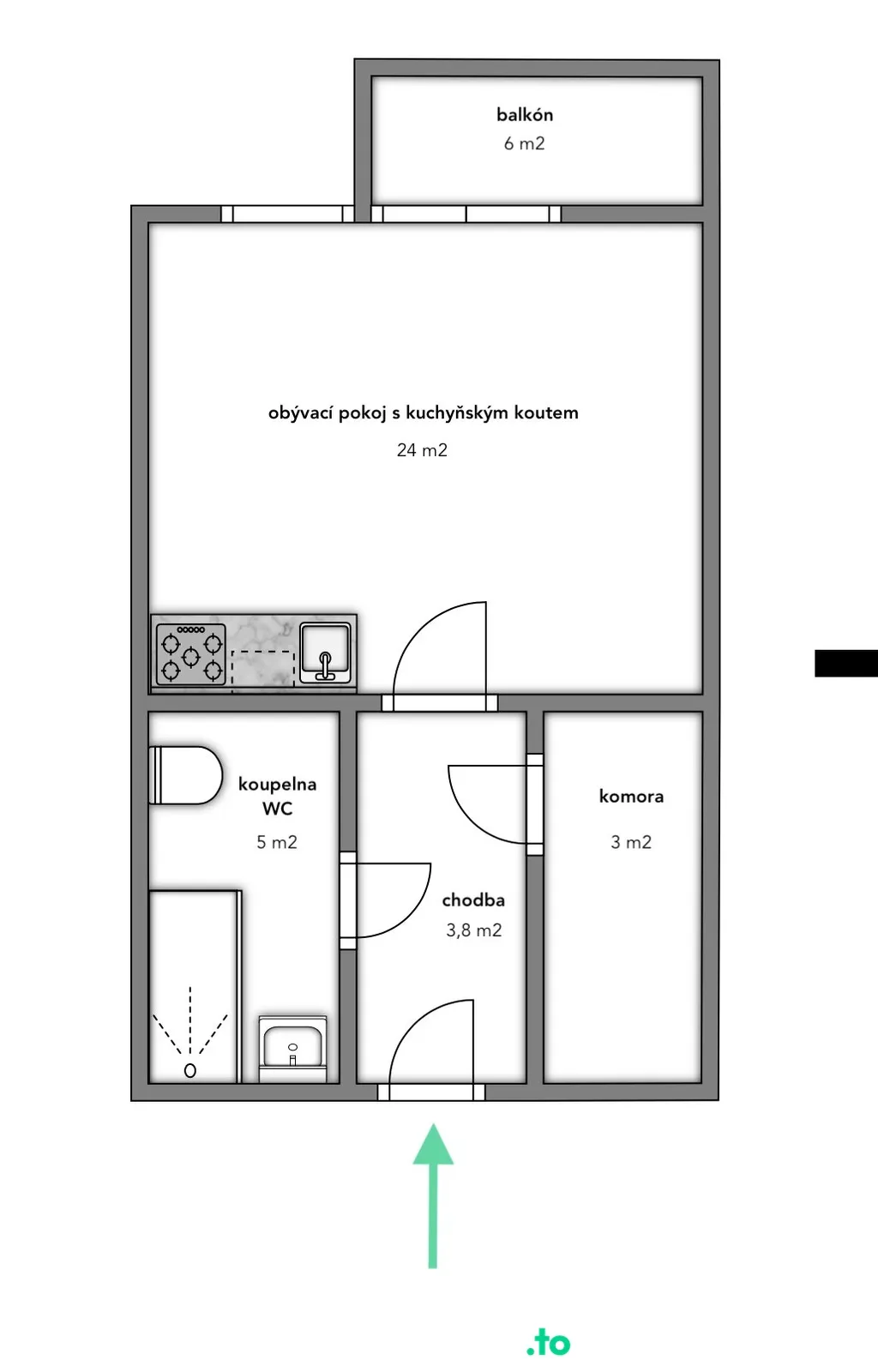 Otevřený obytný prostor umožňuje flexibilní uspořádání nábytku a pohodlné bydlení pro jednotlivce. Balkón přirozeně rozšiřuje obytnou část a vytváří příjemné místo pro odpočinek.