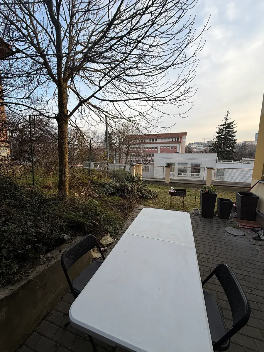 Na terasu navazuje zahrada se vzrostlým stromem, který poskytuje přirozený stín a příjemnou atmosféru v letních měsících. Již nyní jsou zde vysazeny okrasné rostliny, které dotvářejí útulný charakter prostoru. Zahrada vybízí k dalšímu zútulnění – ať už doplněním zahradního nábytku, bylinkové zahrádky nebo vytvořením relaxační zóny. Díky velikosti prostoru zde může vzniknout například venkovní sauna, rozšířená zimní zahrada nebo přístřešek navazující na byt, který umožní celoroční využití venkovní části.