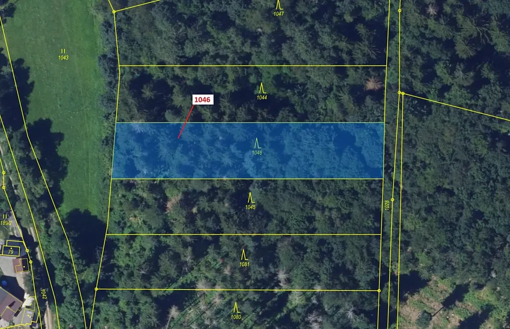 Lesní pozemek o výměře 2432 m2, parcelní číslo 1046, podíl 1/1, katastrální území Hrdá Ves, obec Vír, obec s rozšířenou působností Bystřice nad Pernštejnem, okres Žďár nad Sázavou, Kraj Vysočina. Po těžbě.