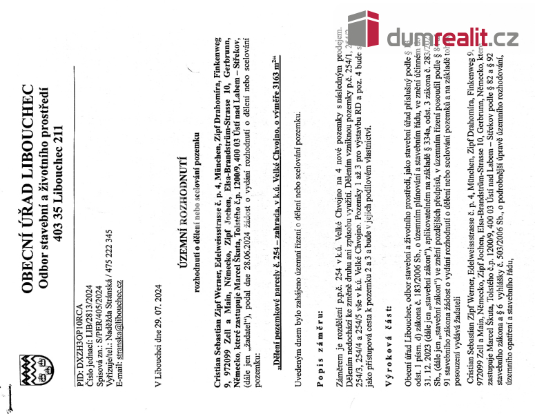 255/4 každý o výměře 700 m² v krásném prostředí obce Velkého Chvojna. Stavební povolení pro rozdělení pozemků na čtyři parcely mame schválené jak stavebním úřadem tak i krajským rozvojovým úřadem tudíž nebrání nic k výstavbě rodinných domu a je již zapsáno v katastru nemovitostí. Ten to pozemek je ideální pro výstavbu rodinného domů, který můžou mít dvě nadzemní podlaží a podkroví.